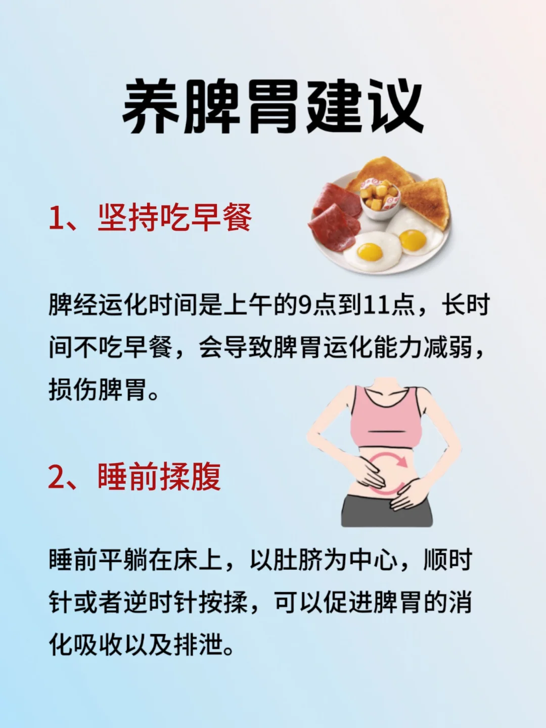 脾经运化时间是上午的9点到11点,长时间不吃早餐,会导致脾胃运化能力减弱,损伤脾胃。