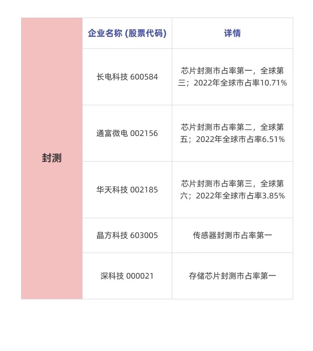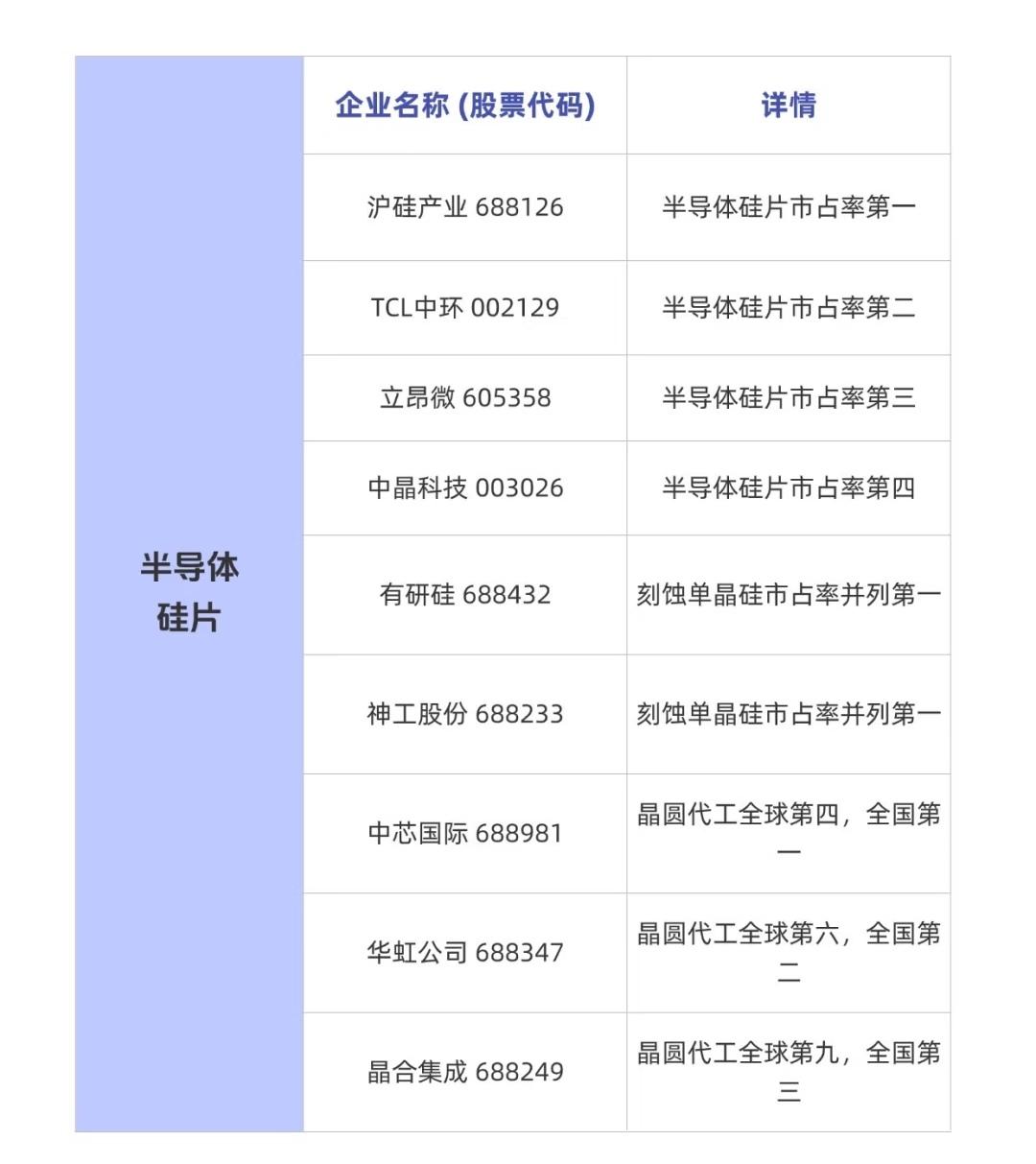 半导体产业链中与“涨价”或“市场地位”相关的核心企业信息: 一、存储芯片相关企业(半导体涨价概念核心方向之一) 1. 江波龙(301308):存储芯片模组市占率A股第一 2. 佰维存储(688525):存储芯片模组市占率A股第二 3. 德明利(001309):存储芯片模组市占率A股第三 4. 开普云(688228):内存模组市占率2.3%,固态硬盘(SSD)市占率8% 5. 兆易创新(603986):利基型DRAM市占率A股第一 6. 北京君正(300223):车用型DRAM市占率A股第一 7. 普冉股份(688766):NOR FLASH全球市占率4% 8. 恒烁股份(688416):NOR FLASH全球市占率2.7% 9. 聚辰股份(688123):EEPROM市占率A股第一 10. 香农芯创(300475):海力士(SK海力士)授权分销商,与存储芯片供应链密切相关 👉 说明:存储芯片是近期半导体涨价关注度最高的方向之一,上述企业在模组、DRAM、NOR Flash、EEPROM、SSD等细分领域具有较高的市占率或供应链地位。 二、半导体硅片企业(半导体上游关键材料) 1. 沪硅产业(688126):半导体硅片市占率第一 2. TCL中环(002129):半导体硅片市占率第二 3. 立昂微(605358):半导体硅片市占率第三 4. 中晶科技(003026):半导体硅片市占率第四 5. 有研硅(688432):刻蚀单晶硅市占率并列第一 6. 神工股份(688233):刻蚀单晶硅市占率并列第一 👉 说明:硅片是芯片制造的核心基础材料,其价格波动对整个半导体产业链影响重大。上述企业在硅片及刻蚀用单晶硅领域处于国内领先位置。 三、晶圆代工企业(芯片制造环节) 1. 中芯国际(688981):晶圆代工全球第四、全国第一 2. 华虹公司(688347):晶圆代工全球第六、全国第二 3. 晶合集成(688249):晶圆代工全球第九、全国第三 👉 说明:晶圆代工是芯片生产的重要环节,也是半导体涨价的成本驱动环节之一。中芯国际和华虹在国内处于龙头地位,全球排名靠前。 四、封测企业(芯片后道工序,与产能利用率和涨价关联密切) 1. 长电科技(600584):芯片封测全球第三,2022年全球市占率10.71% 2. 通富微电(002156):芯片封测全球第五,2022年全球市占率6.51% 3. 华天科技(002185):芯片封测全球第六,2022年全球市占率3.85% 4. 晶方科技(603005):传感器封测市占率第一 5. 深科技(000021):存储芯片封测市占率第一 👉 说明:封测是芯片制造的最后一道关键程序,其产能利用率直接影响芯片供应,也是观察半导体景气度的重要指标。长电、通富、华天为国内封测“三巨头”,晶方和深科技则在细分领域占据龙头。 总结: 您上传的这三张图片系统梳理了当前半导体产业链中与“涨价”或“高市占率”高度相关的核心企业,覆盖了: - 存储芯片(涨价焦点) - 半导体硅片(上游原材料) - 晶圆代工(制造环节) - 封测(后道产能) 这些企业在各自细分市场中占据重要地位,是观察半导体行业周期、价格走势以及投资机会的重要参考标的。