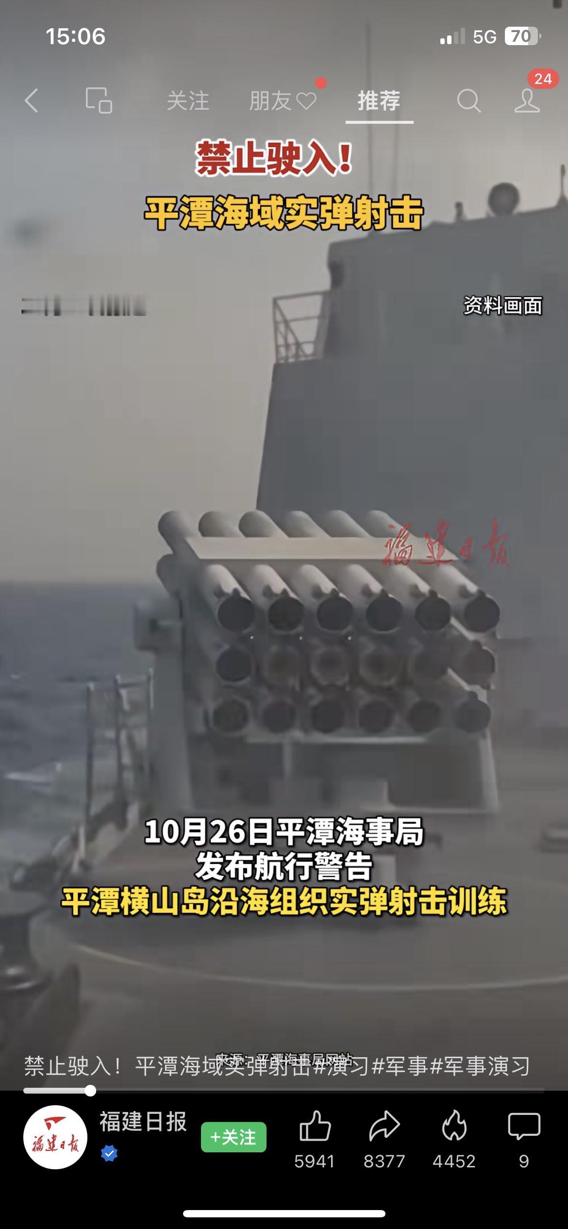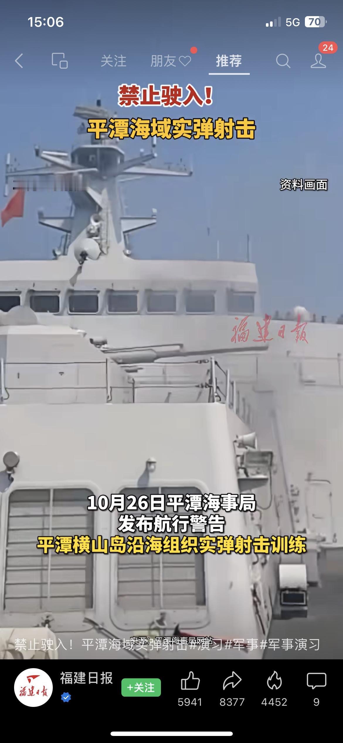 紧急通知!平潭海域刚封了!实弹射击已开练,所有船只能绕就绕! 家人们注意!就在昨天(10月26日),平潭海事局刚发了航行警告——平潭横山岛附近海域要搞实弹射击训练,现在已经全面禁止船只驶入了! 看这军舰上的装备,炮管都摆得整整齐齐,这训练力度可不是闹着玩的!咱平时在新闻里看军事演练觉得离得远,这次直接在咱福建家门口安排上了,安全感直接拉满! 提醒附近的船老大们千万绕路,别好奇往那边凑哈,安全第一!具体训练时长暂时没说,近期路过这一片的一定要多留意海事通告!看海平潭