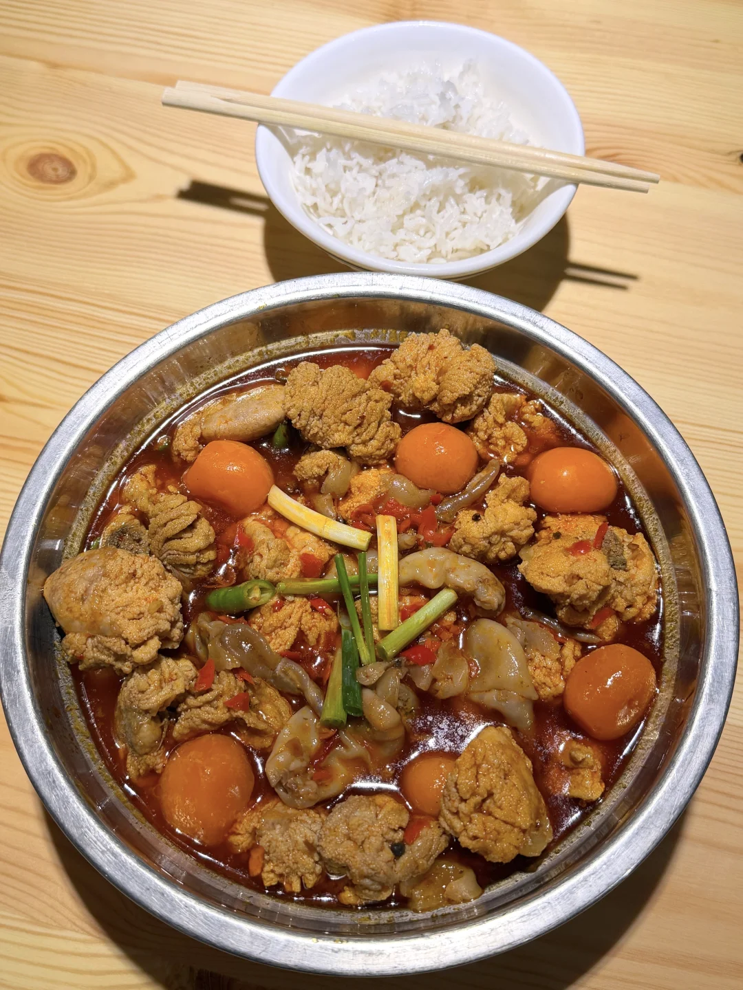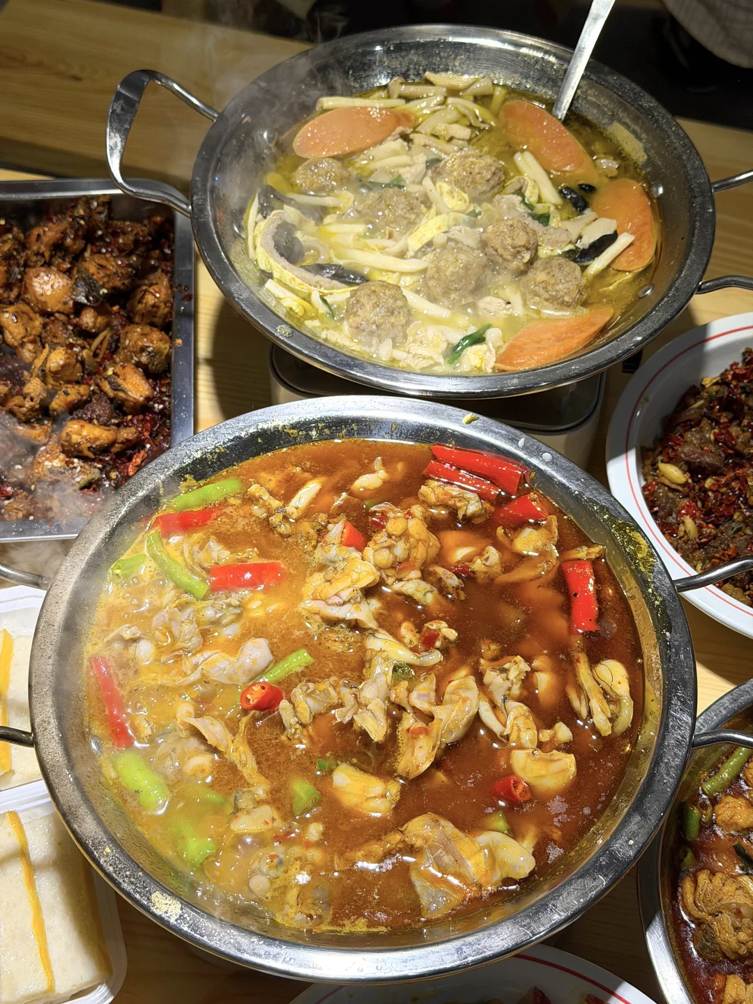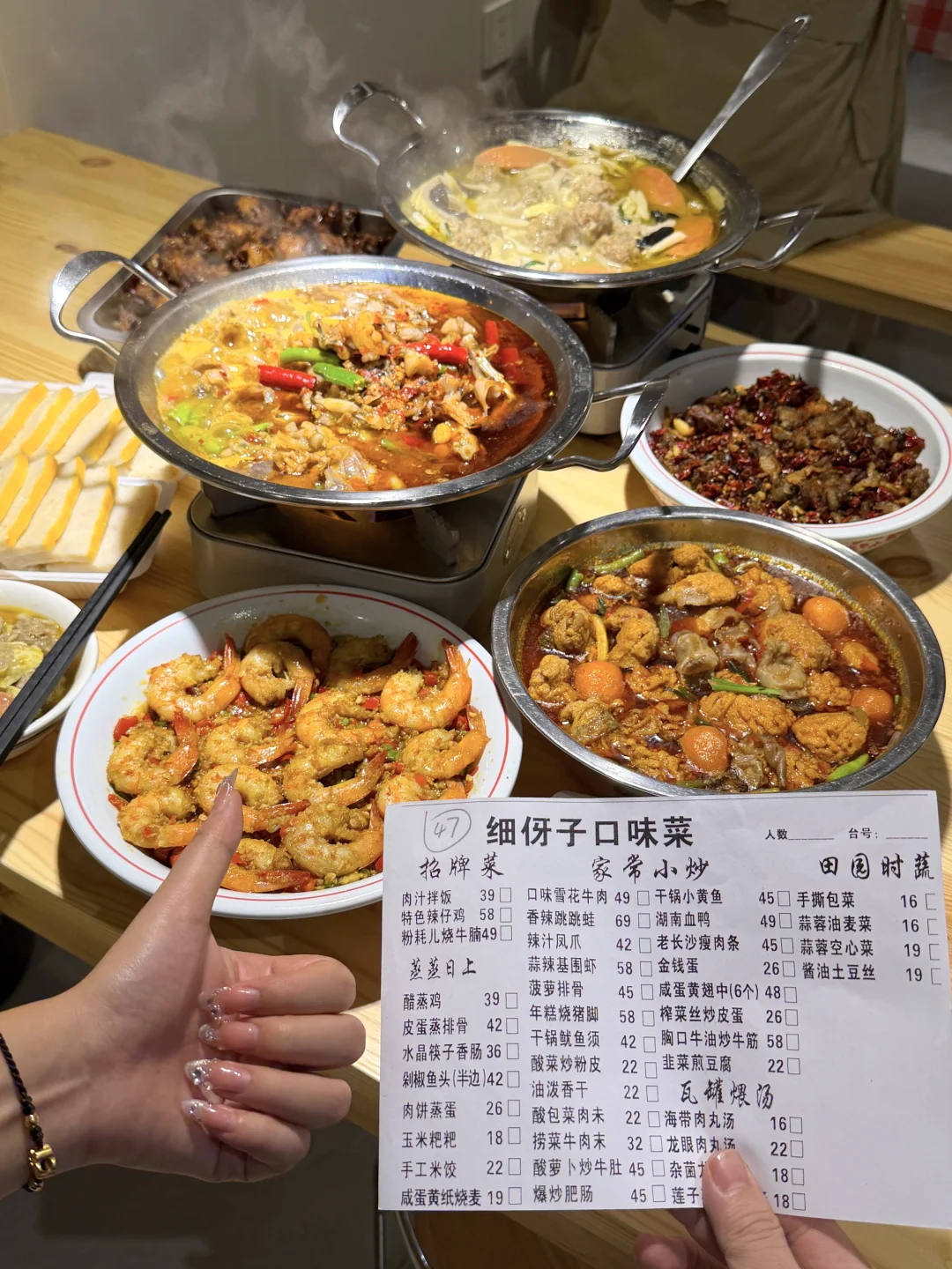 跟着本地人去吃的!五一广场地铁口步行几分钟, 反复打卡了10多次有了、基本上每道菜都下饭! 📍叫:细伢子。。口味菜。。。 人均三四十左右、真心平价好好吃😭😭全家福火锅!手工蛋卷+肉丸+火腿肠,冒着热气越煮越入味,汤好鲜!喜欢这口的建议来这里试试!!牛蛙、鱼籽鱼泡、辣子鸡…都好好吃!!!