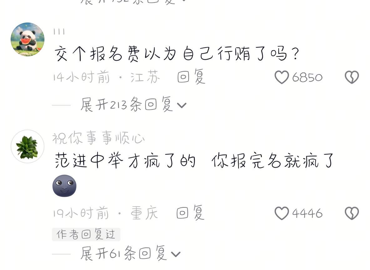 “好纠结,万一国考考进中央怎么办?” 史上最好笑的评论区出现了,网友们纷纷回复,小嘴像淬了毒一样! “把心放进痔疮里……” “回家插秧都插不到正中央。” “交个报名费以为自己行贿了吗?” 这位同学还是看的盗版书,不行咱还是看正版吧,学了几天咋还先疯了呢? 甚至还担心北京的气候无法适应,属实是有点好笑了。 不过,在这位同学发布这样一条视频后,大部分都是为了玩抽象跟风的。 我有时候也想着万一彩票中奖是先买房还是先买车呀?大家觉得呢?