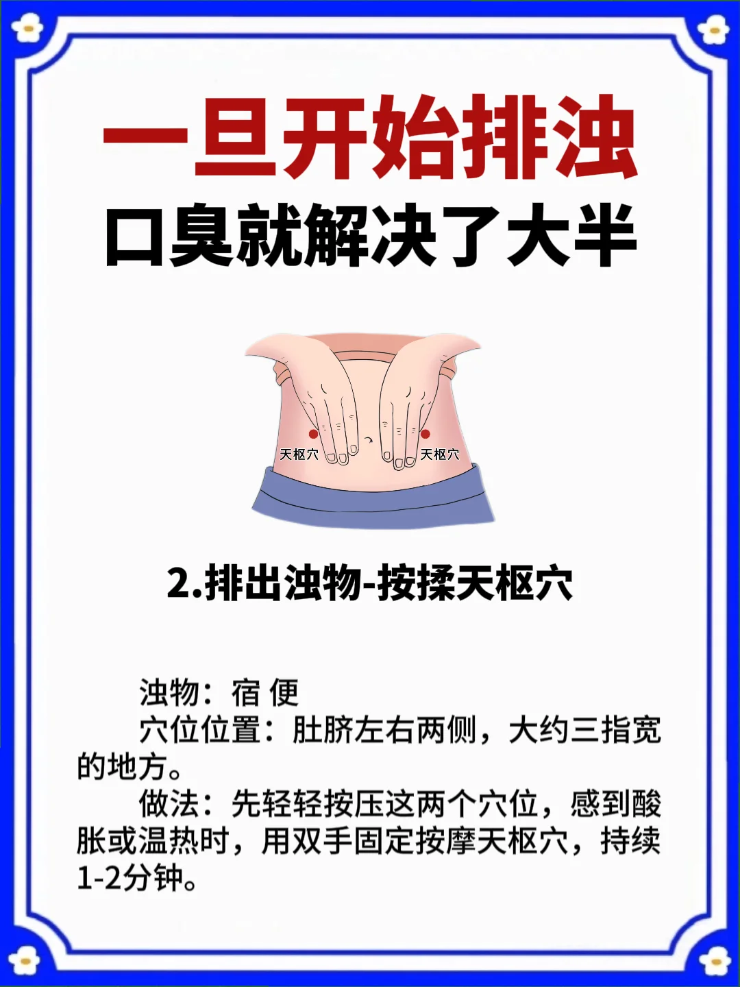 做法:先轻轻按压这两个穴位,感到酸胀或温热时,用双手固定按摩天枢穴,持续1-2分钟。