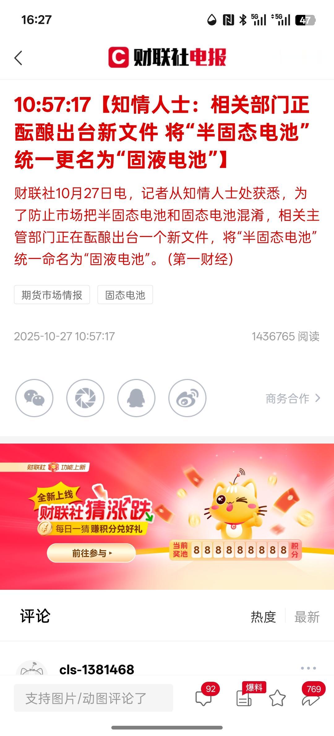 出台新文件 将“半固态电池”统一更名为“固液电池”。那你们现在就看你们还有谁敢碰瓷固态电池?知情人士:相关部门正酝酿出台新文件 将“半固态电池”统一更名为“固液电池”。 这就是防止那些车企借用固态电池之名,想蹭热点,尤其是那些没有核心技术的车企,以及电子企业,想趁固态电池的热度来进行达到营销目的!看固态电池,他就不算固态电池,只能是固液电池,支持这样的决定!