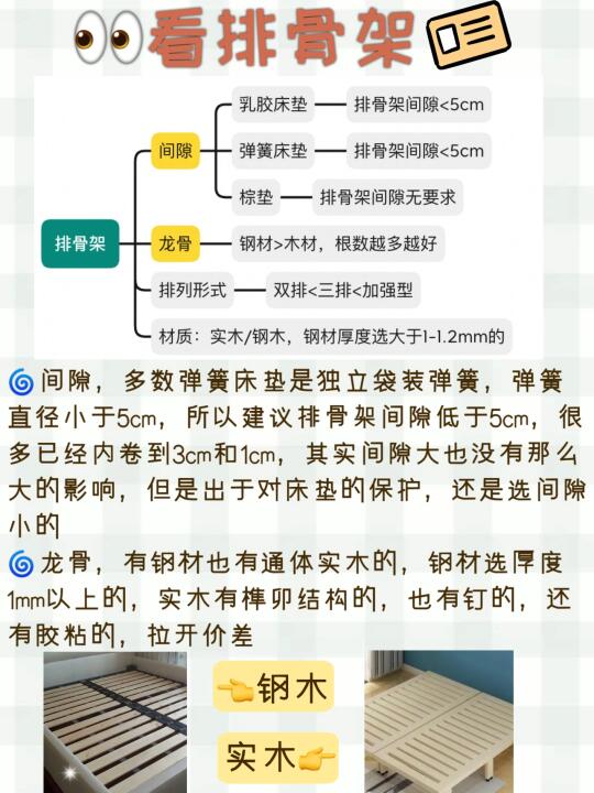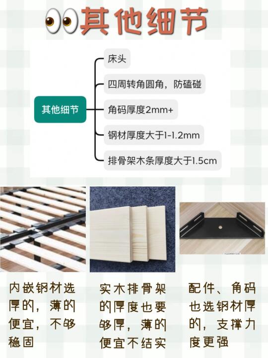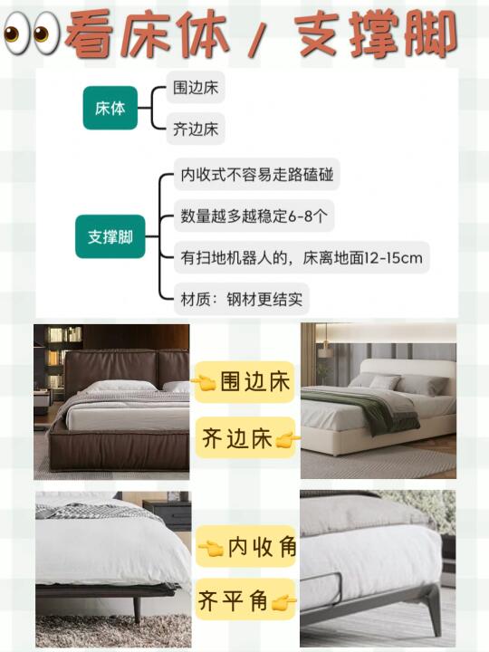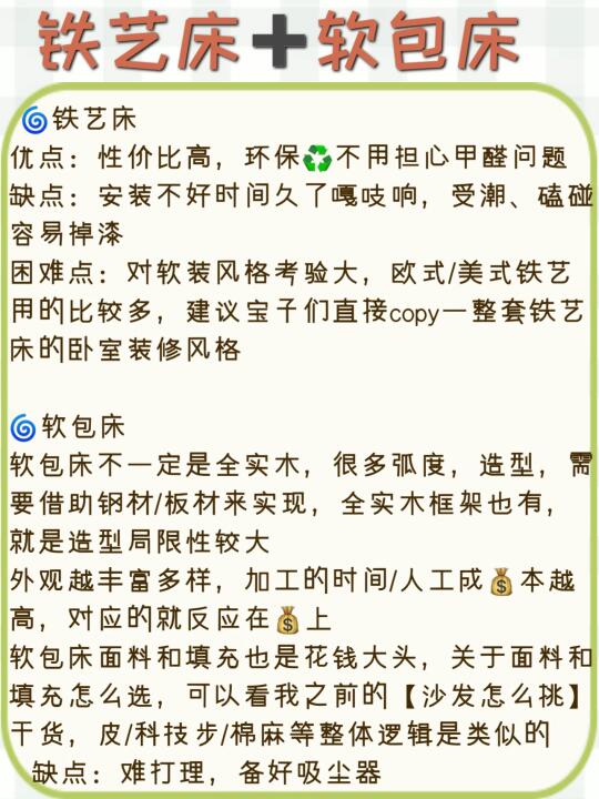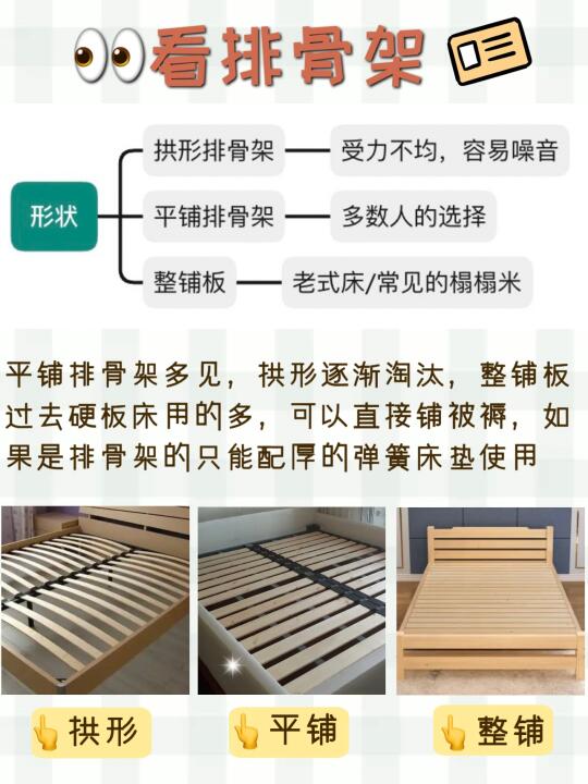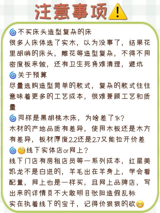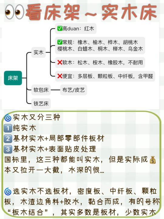 这几天来问床如何挑选的宝子太多了,没办法,干货之前都梳理过,再发一遍~ 希望能给大家理清一点点🤏思路,少踩坑~ 敲黑板!上干货👇👇 ✅看床架 常见的是实木床、铁艺床、软包床(皮艺+布艺),具体细节看图⬆️ ✅实木床注意事项 1⃣️纯实木 2⃣️基材实木+局部零部件板材 3⃣️基材实木+表面贴皮处理 国标里,这三种都能叫实木,但是实际成💰本又拉开一大截,水深的很... ⚠️选实木不选板材 密度板、中纤板、颗粒板,木渣边角料+胶水,黏合而成,有的号称“板木结合”,其实多数是板材,少数实木 ✅软包床注意事项 软包床不一定是全实木,很多弧度,造型,需要借助钢材/板材来实现,全实木框架也有,就是造型局限性较大 外观越丰富多样,加工的时间/人工成💰本越高,对应的就反应在💰上 软包床面料和填充也是花钱大头,关于面料和填充怎么选,可以看我之前的【沙发怎么挑】干货,皮/科技步/棉麻等整体逻辑是类似的 缺点:难打理,备好吸尘器 ⚠️注意事项 🌀品牌要看!配置也要看! 可以认准品牌但是不能只看品牌,核心还是看配置,大品牌的低配可能比不上中等品牌的高配,每个品牌下有非常多不同质量不同价位的床,擦亮👀横向纵向货比三家 🌀🧐线下实体店or网上? 线下门店有房租店员等一系列成本,红星美凯龙不是白进的,羊毛出在羊身上,学会看配置,网上也是一样买,且网上品牌店,写出来的详情页不大敢明目张胆造假乱标 实在执着线下的宝子,记得价狠狠的砍😬试睡多睡会,不要不好意思! 🌀不买床头造型复杂的床 很多人床体选了实木,以为没事了,结果花里胡哨的床头,雕花等造型复杂,不得不用密度板来做,还有卫生死角难清理,避坑 🎈好啦,关于床的干货就整理这么多,具体看图⬆️⬆️ 😊我是小十一,电商从业7年 提倡理性消费🥳持续分享网go干货 还有其他想看的内容可以评论区告诉我,我来出攻略 觉得有用记得关注我哦💗你们的👍💗⭐️是我持续更新的动力🤗 👉往期的【网go干货避坑指南】,可以去我🐷页康康~