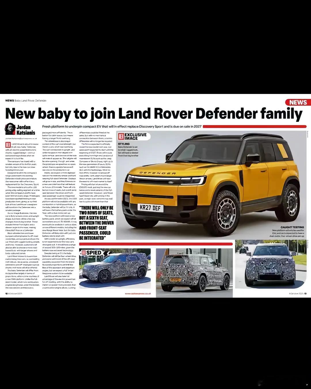 国内很多媒体都说这是全新发现运动,其实这是卫士运动版,发现运动要长这样那估计得卖爆了……这台车目前还处于研发测试阶段,预计2027年正式上市,定位紧凑型纯电SUV,倒是和发现运动是一个级别的,对标奔驰马上推出的小G级(BabyG-Class)
