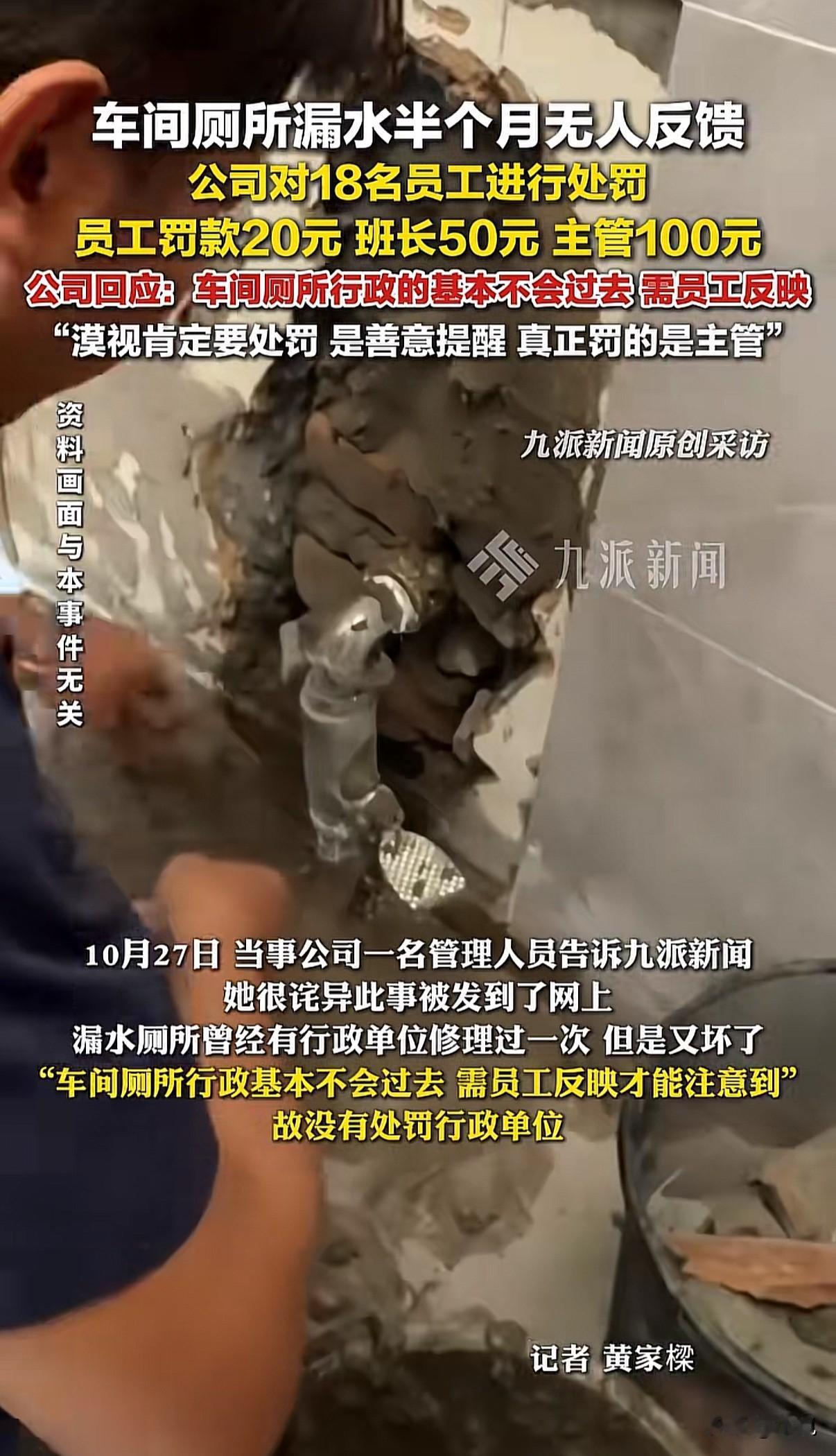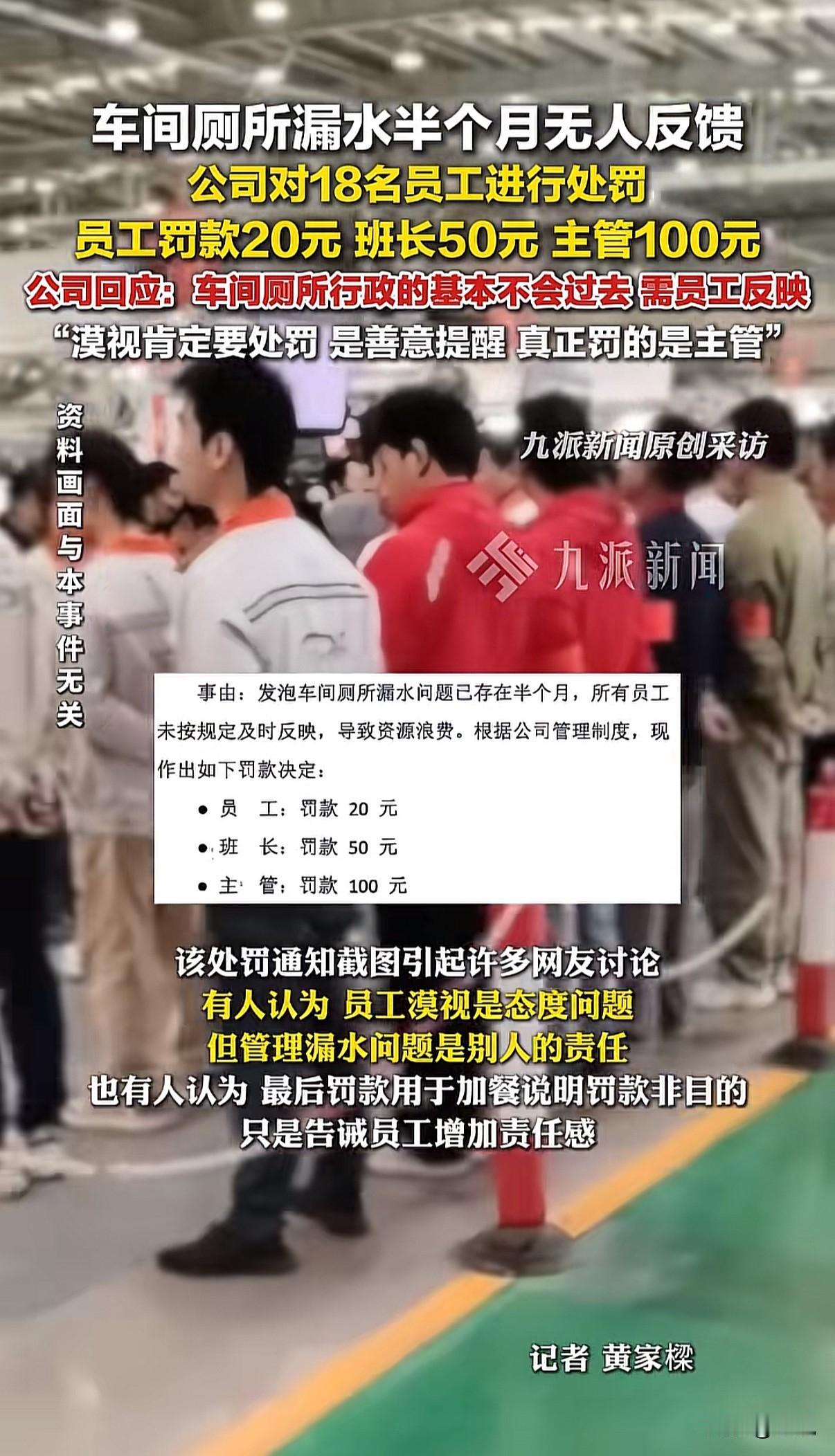 东莞某公司发泡车间厕所漏水整整半个月。没人报修,公司直接开出罚单:员工罚20,班长罚50,主管罚100,总共18人中招。只有修水管的两人和一个新员工幸免。 罚款直接从9月工资里扣。公司说这笔钱将来给员工加餐用。 这事上了热搜后,公司管理人员很惊讶。她解释:漏一两天没事,漏半个月就过分了。员工心里不舒服能理解,但这种漠视态度必须处罚。20元只是善意提醒,主要罚的是管理层。 但仔细看,问题来了。该公司管理人员承认,行政人员平时根本不去巡查那个车间的厕所。厕所之前修过一回,第二次漏水时,因为没人报告,就一直漏着。 说白了,公司把管理责任转嫁给了员工。设施维护本该是公司的基本职责,现在却要普通员工来操心。 法律上站不住脚。《工资支付暂行规定》明确,只有因员工原因造成直接经济损失时,才能扣除工资。厕所漏水怎么都算不到员工头上。 这种“拿你的钱请你吃饭”的操作,实在讽刺。员工被罚了款,月底加餐时看着用自己钱买的菜,不知作何感想。 管理漏洞让员工买单,这才是最让人无语的。好的管理应该建立畅通的报修渠道和定期巡查制度,而不是等问题严重了四处甩锅。 如今很多企业都类似,管理问题转嫁给基层。打工人不容易,维权要牢记:保留证据,沟通无效就找劳动监察大队。不是为那20块钱,是为争一口气。