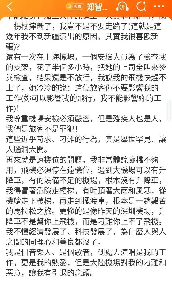 感觉郑智化为自己维权的情绪有点过,发文吐槽深圳机场的服务,说自己收到不公正待遇的内容有些夸大其词。深圳机场也及时的发文道歉了。或许郑智化觉得是在为所有残疾人发声,希望得到更完美舒适优良的服务。 郑智化是我们大家都喜欢的一名台湾残疾人歌手,《水手》《麻花辫》《别哭,我最爱的人》《星星点灯》《年轻时代》等歌曲当时风靡两岸三地。至今仍在传唱。 当然,对残疾人的照顾关爱还需要进一步完善和加强,希望残疾人都能得到和普通人正常人一样相应的权利和义务。 郑智化出场费 郑智化发文吐槽深圳机场会带来哪些影响