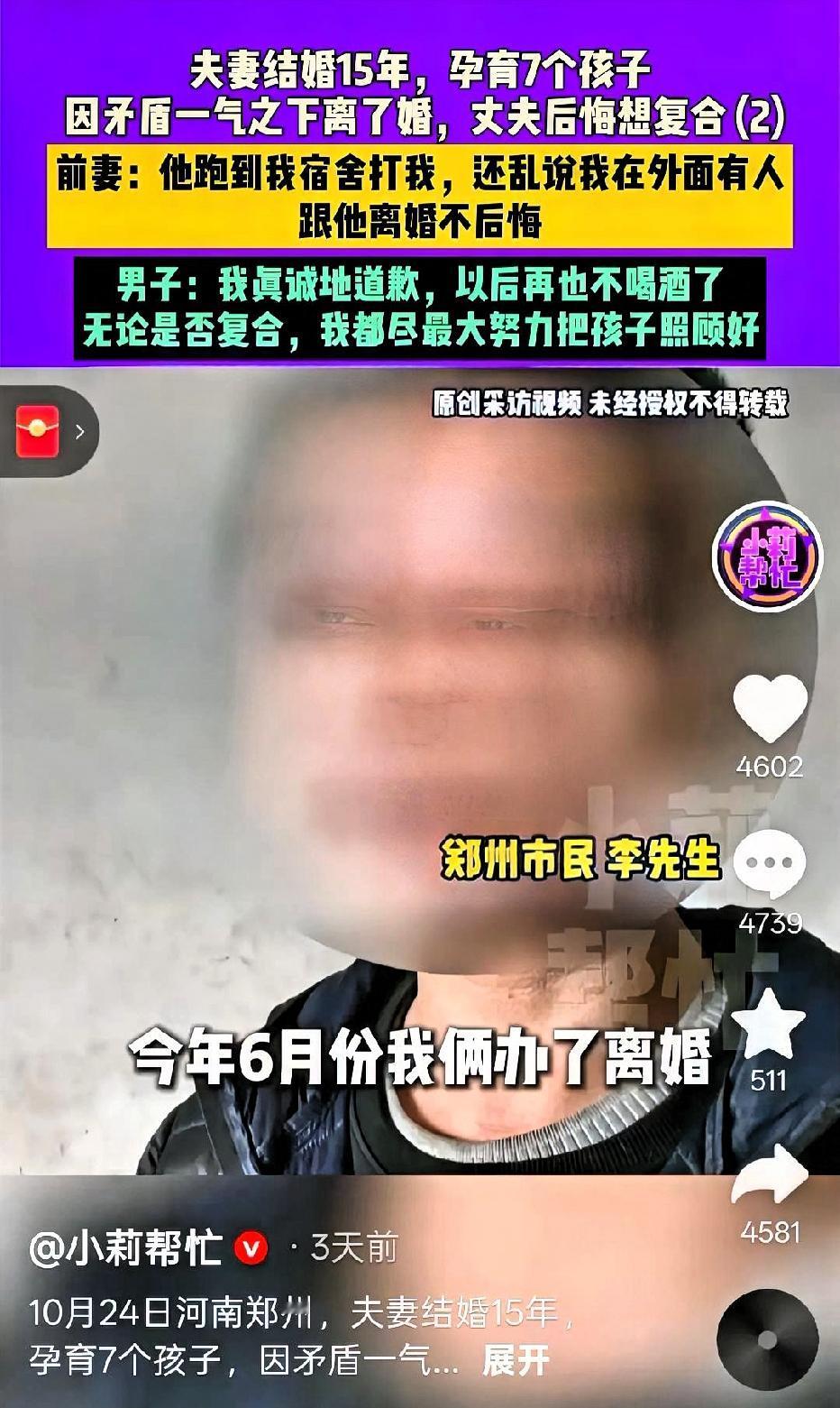 不知道大家有没有刷到这条新闻 真的要给我笑晕又气炸[捂脸]! 婚姻15年,7个孩子加老人全靠妻子一人扛,没一句感恩就算了,还把人撵走离婚。结果自己顶了几天就扛不住,转头全网道歉说后悔,这算盘打得,嫦娥在月亮上都听着响了! 这哪是真心悔过啊,分明是发现“免费保姆”没了,自己吃不了苦才急眼。多少婚姻里,妻子的付出被当成理所当然,直到失去才懂那份辛苦有多沉重。 所谓的后悔,从来不是心疼妻子的委屈,只是舍不得有人替自己包揽所有琐事。这种“后悔”太廉价,根本不值得原谅! 你们觉得前妻该回头吗?要是你遇到这种事,会怎么选?