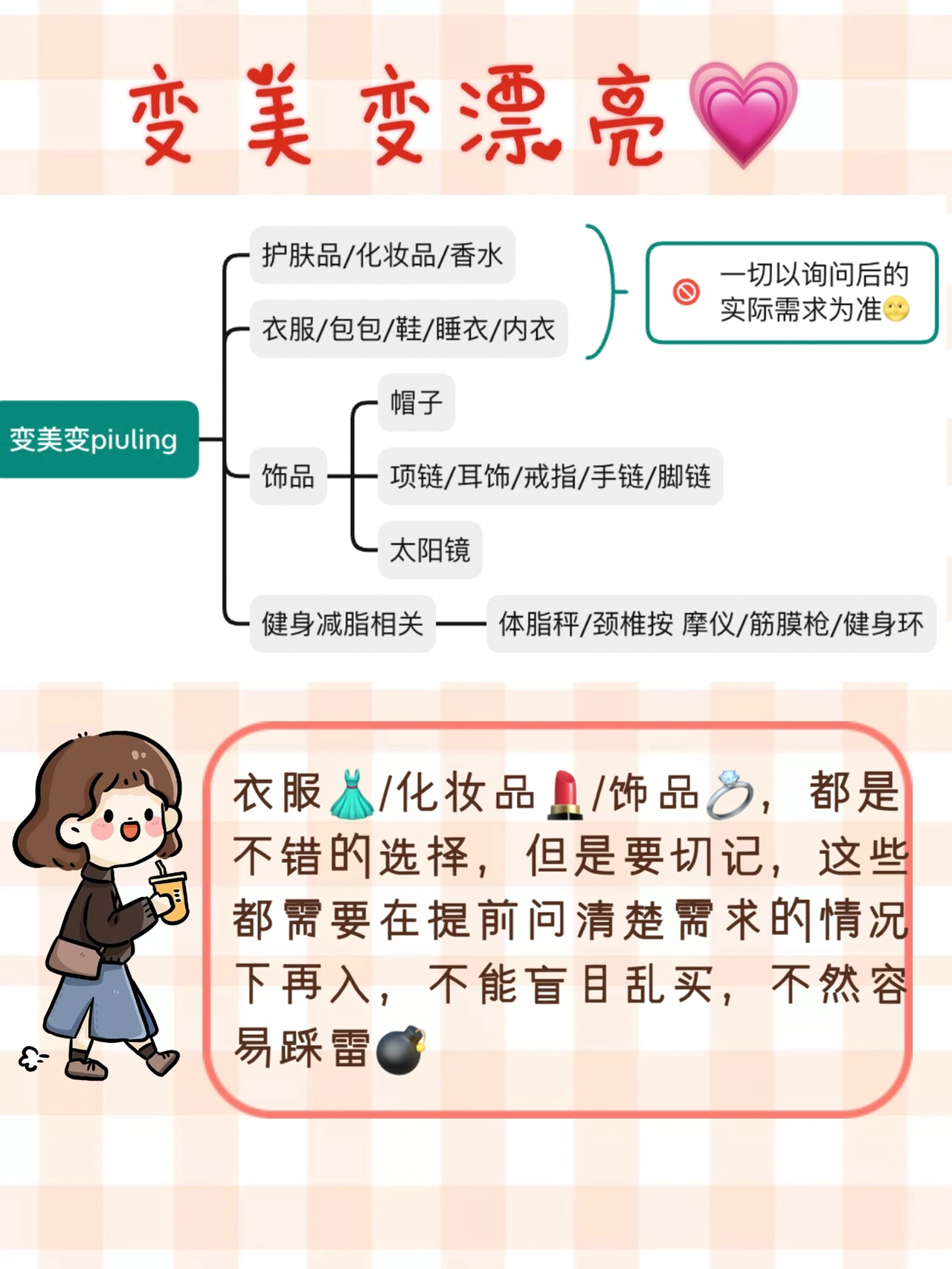衣服👗/化妆品💄/饰品💍,都是不错的选择,但是要切记,这些都需要在提前问清楚需求的情况下再入,不能盲目乱买,不然容易踩雷💣
