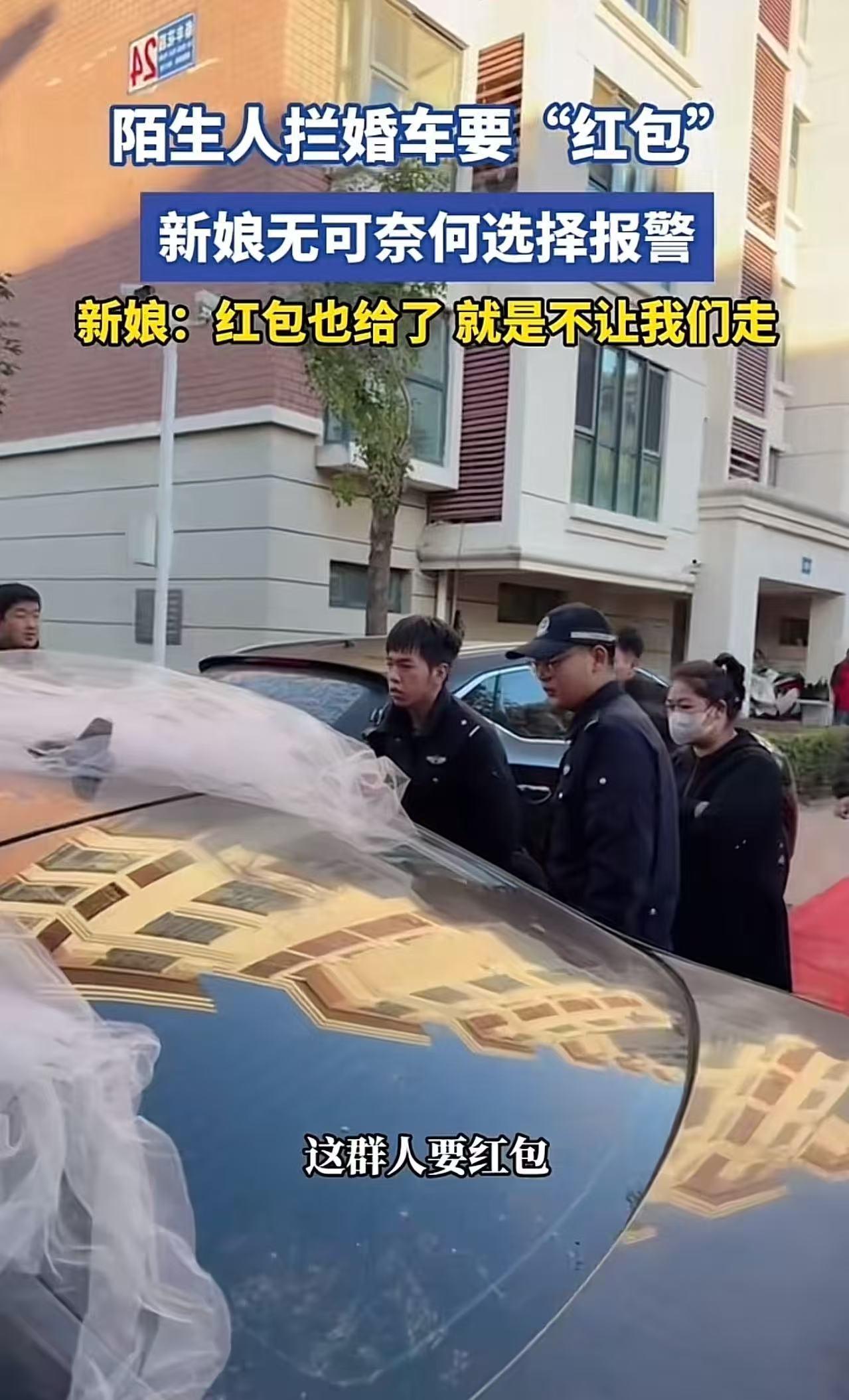 河北,陌生人拦婚车要“红包”,新娘无可奈何旋转报案!新娘:红包也给了,嫌少不让我们走!网友:拦婚车是哪个地方的风俗?非亲非故你有脸跟人家要几条香烟和红包?人家给你一根香烟就不错了,这完全就是拦路抢钱。 这天,婚车正准备开出小区。突然,一群人不知从哪儿冒了出来,一窝蜂地涌到婚车前,张嘴就讨要喜钱和喜烟。 新人看着眼前这些陌生的面孔,心里虽然有些不悦,但想着大喜的日子,多一事不如少一事,便强忍着不快,给每个人都分了喜糖和红包! 原本以为这样就能顺利通行了。可谁能想到,这群人得了便宜还卖乖,竟然开始起哄,七嘴八舌地说给得太少,死活就是不肯让路。 时间一分一秒地过去,眼看着吉时就要过了,新娘心里又急又气,只好选择报案求助。 很快,民警赶到了现场。民警看着一脸焦急又委屈的新娘,关切地问道:“怎么回事啊?” 新娘带着哭腔,气呼呼地说:“我今天结婚,本来高高兴兴的,这群人非要红包。红包我都给了,给了不少钱呢,可他们就是不让走,这不是故意刁难人嘛!” 民警听后,眉头紧紧皱了起来,又问道:“谁拦着不让走的?” 新娘指着那群人,激动地说:“就是这些人,我一个都不认识他们。他们再这么闹事,我这怀着孕呢,心脏又不好,万一出了什么事可怎么办!” 民警连忙安慰新娘:“你消消气,别着急,接下来交给我们来处理,肯定不会让你们耽误了吉时。” 此事引发了热议,有网友说,有些人穷疯了,我儿子结婚时进小区,他们就在门口拦着,提前一天我们就给了门卫四百,结果当天他们又不让进,一些大爷大妈也起哄,我儿媳妇也是特别生气,没办法又给了二百! 也有网友说,这跟拦路抢劫有什么区别?他们有什么权力拦车?警方不能和稀泥,抓起来拘留看以后谁还敢? 还有网友说,闹婚的人不地道。吃个糖,抽颗烟都可以。人家结婚嘛,大喜的日子,你们不是给人家添堵吗? 在婚礼上,给亲朋好友分些喜糖、喜烟,本是图个喜庆、传递幸福的好事。但如果已经按照习俗给过红包了,却还不依不饶,死活不让路,这就实在太过分了。 这种行为早已超出了传统习俗的范畴,变成了一种无理的索取,甚至可以说是一种变相的“抢劫”。 我们不能让一些不良风气打着传统习俗的幌子,肆意破坏社会的公序良俗。 真正的传统习俗应该是充满温情与祝福的,而不是成为某些人谋取私利的工具。 对于这种恶意拦婚车索要财物的行为,必须坚决抵制,让婚礼回归它原本的纯净与美好! (来源:吉祥新知)
