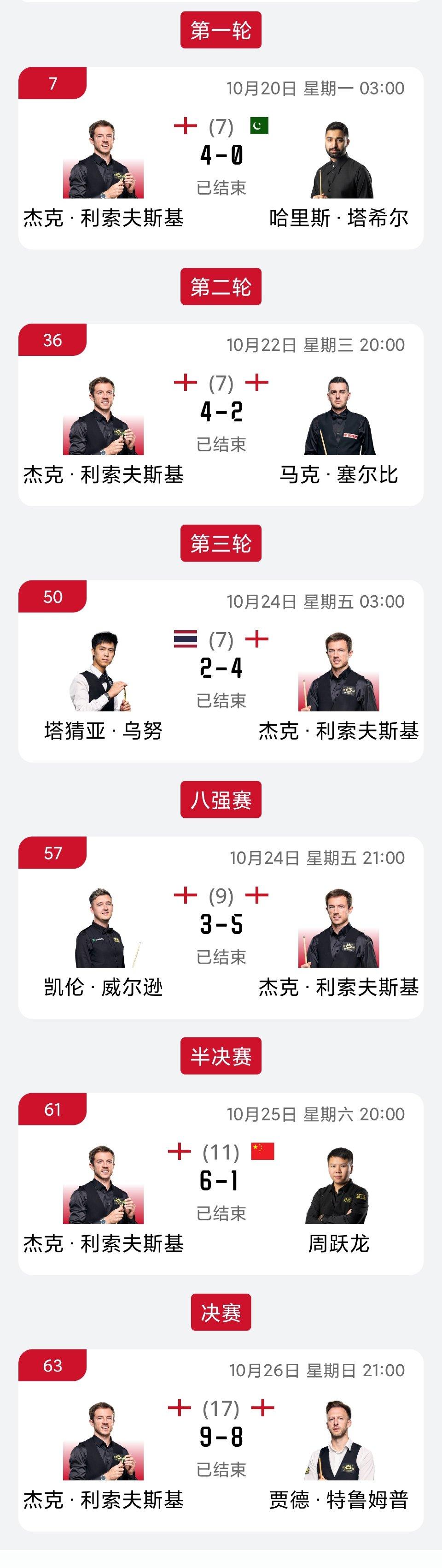利索夫斯基这个冠军含金量挺高的,一路连克3位世界冠军,击败三位世界前十,还有本赛季状态火热打出两杆满分的塔猜亚。