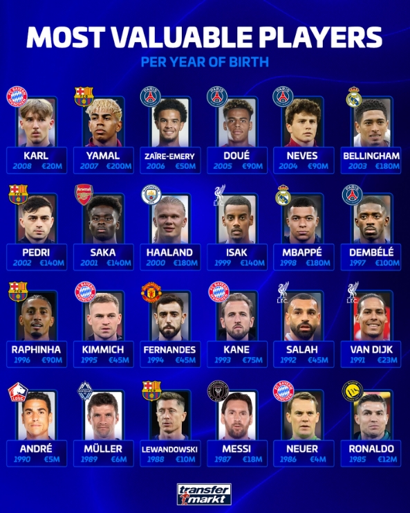 直播吧10月27日讯德转统计了各年龄段身价最高球员,其中,梅西、C罗、哈兰德、姆巴佩等人在列。