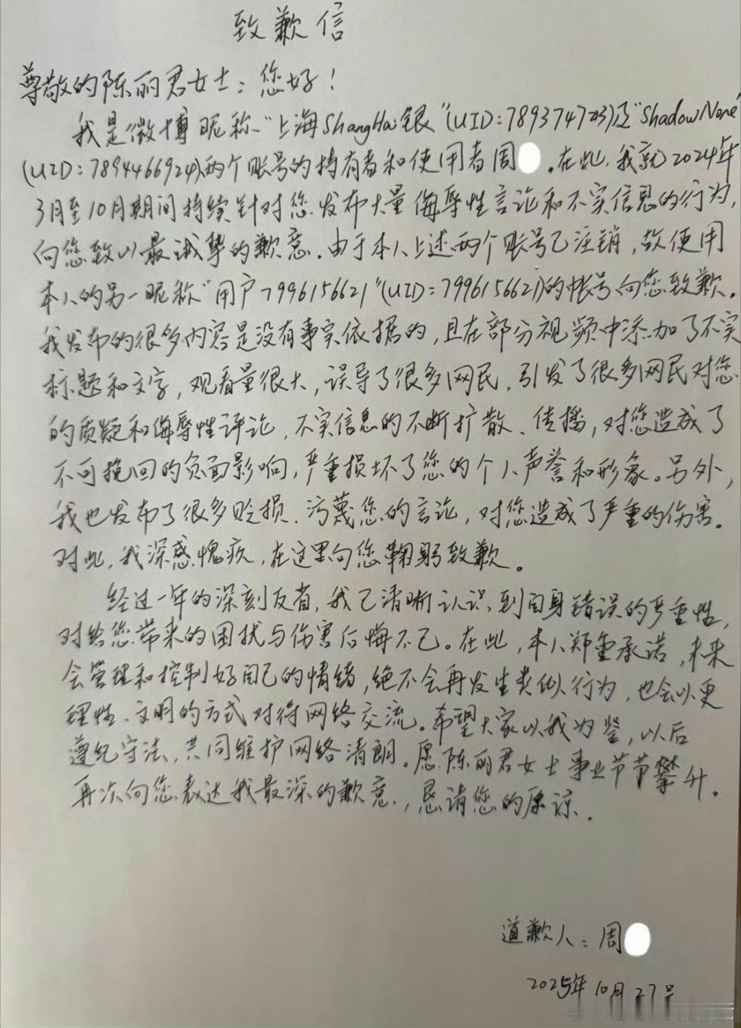 陈丽君告黑成功!黑粉向陈丽君女士公开视频致歉及手写道歉信致歉!