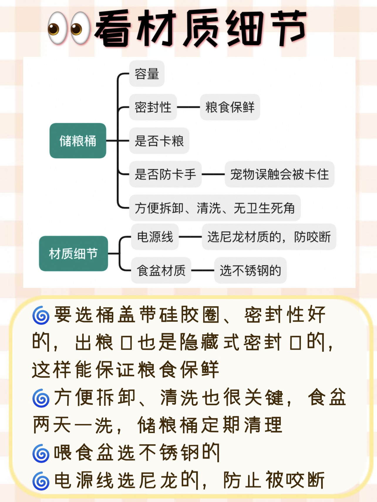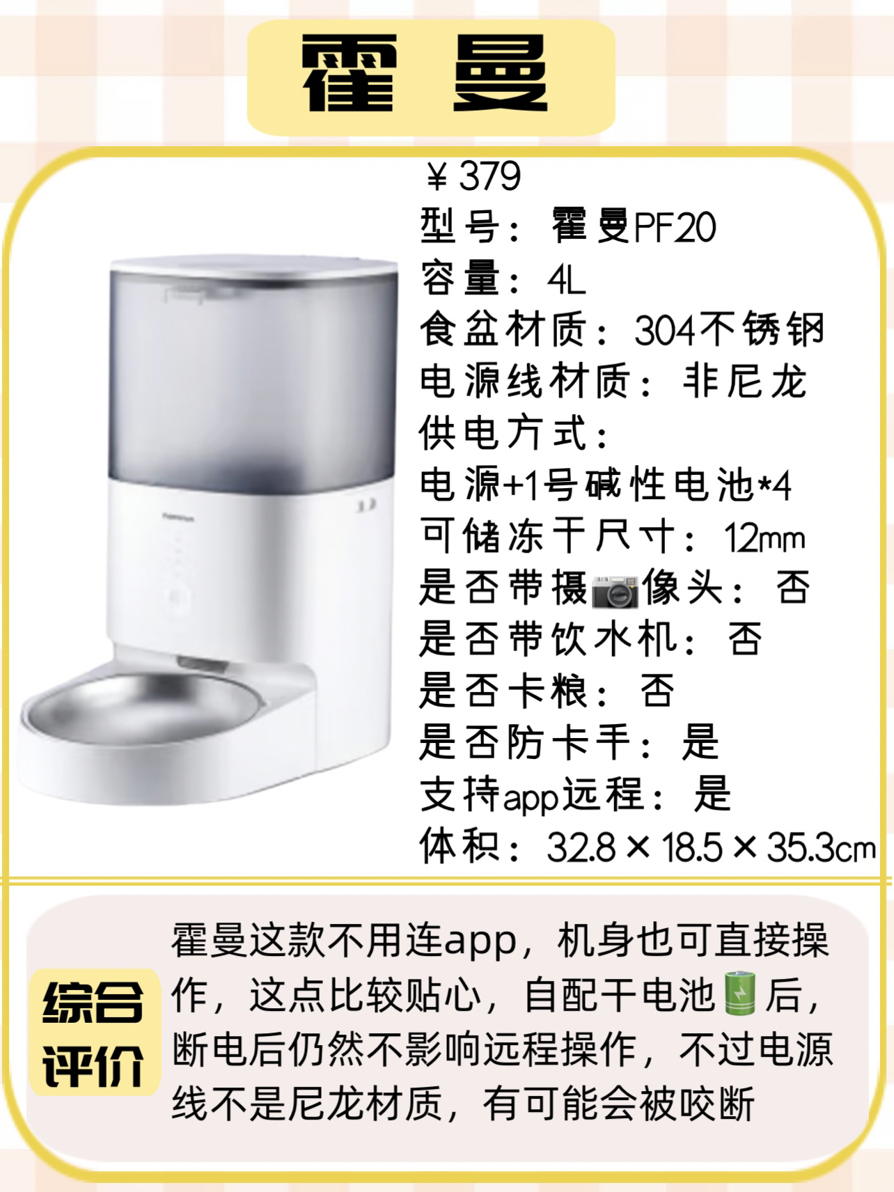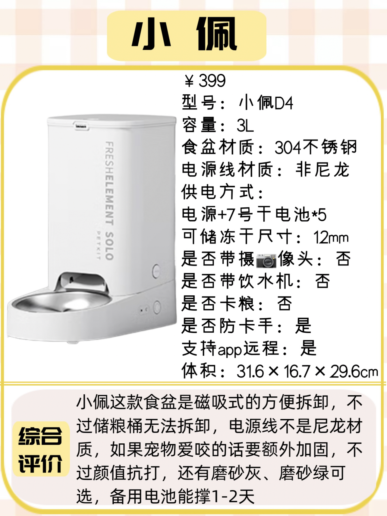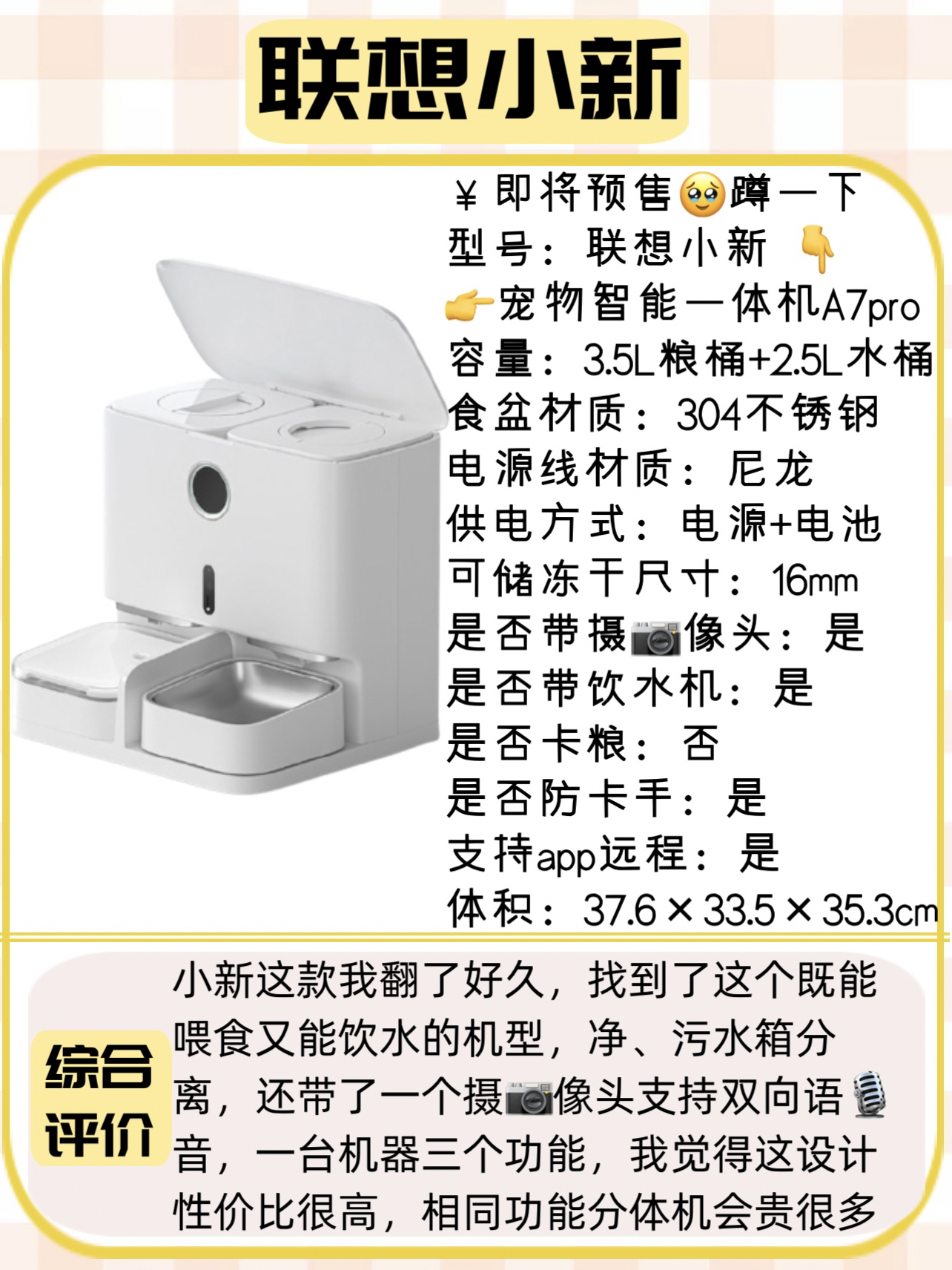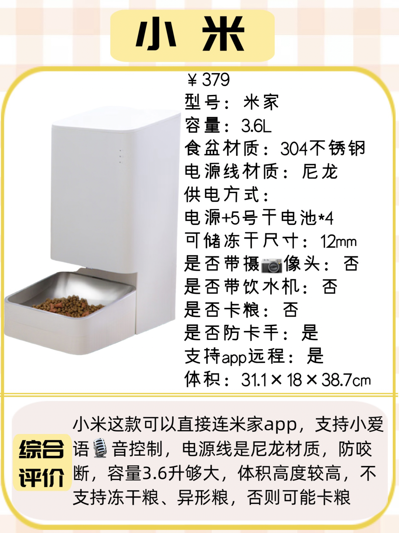 有宝子让我写宠物自动喂食器的测评干货[害羞R] 有时候赶上出差、过年回家,宠物没人喂养确实很不放心,想备一台宠物自动喂食器又不知道怎么挑选🧐 目前市面上很多宠物自动喂食器价💰格参差不齐,看的人眼花缭乱😵‍💫 那到底应该怎么挑选,每款各有什么优缺点呢❓ ✍️仔细去做了下功课,选了4款市面上比较🔥的做了测评 希望能给铲屎官们理清一点点🤏思路 敲黑板‼️上干货👇👇 选宠物自动喂食器,主要看👀机器的以下几个性能 ✅储粮桶容量+密封性 要选桶盖带硅胶圈、密封性好的,出粮口也是隐藏式密封口的,这样能保证粮食保鲜 方便拆卸、清洗也很关键,食盆两天一洗,储粮桶定期清理 ✅看稳定性 供电方式:除了充电使用,还要考虑断电的情况下是否能正常出粮,如果是直接配置锂电池,那就很贴心,断电也不影响机器的正常工作,如果是干电池,需要自备,提前装好,这点也是拉开价差的一个因素 ⚠️保险起见,大家平时就设置好喂食计划,这样即使断电断网也能正常喂食 ✅看材质细节 主要是喂食盆选不锈钢的 电源线选尼龙的,防止被咬断 ✅看加分功能 🌀多数是单纯的喂食机,如果能自带饮水机功能,一机多用 🌀带摄📷像头,省去了单独买摄📷像头的 🌀远程控制功能,可以一键加餐 🌀双向语🎙️音沟通,支持对话更实用 ✅关于品牌🧾 小米、联想小新、霍曼、小佩,这次选了4款网上比较火的,对比了各自的优缺点,具体看图4-图7,宝子们可以参考看看~ ✅写给纠结党星人😣 到底有没有必要入宠物自动喂食器❓ 1⃣️平时周末出去玩/出差多,偶尔出远门 2⃣️宠物不自律,自主进食会过度进食 3⃣️宠物偏肥胖,需要控制进食量维持健康 那可以果断考虑入一台~ 🎈好啦,暂时整理这么多🌀 铲屎官们快去挑适合自家宝子的宠物自动喂食器吧~ 😊我是小十一,电商从业6年 提倡理性消费🥳持续分享网go干货 还有其他想看的内容可以评论区告诉我,我来出攻略 觉得有用记得关注我哦💗 宠物自动喂食器 自动喂食器 铲屎官 智能喂食器 宠物