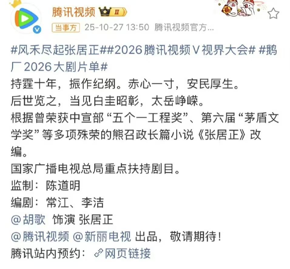 胡歌杀回古装剧赛道,《风禾尽起张居正》官宣男主胡歌,这是他继《琅琊榜》后首次出演古装剧。 《风禾尽起张居正》剧本打磨了多年,就是为了等胡歌点头。这些年古装正剧很难拍,不过有了胡歌和陈道明的组合,这剧就变得很有看点,希望导演和编剧别辜负了观众的期待。