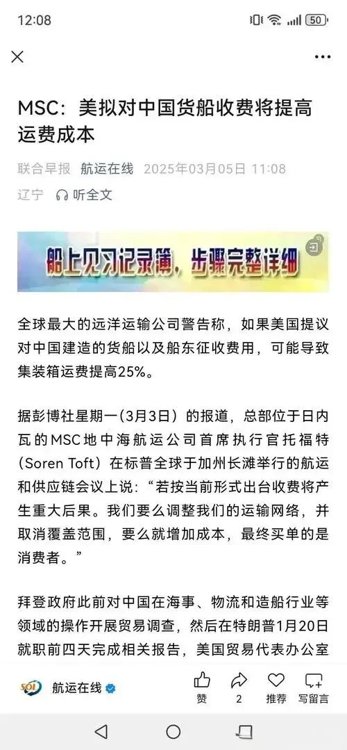 但最魔幻的是 “连坐式处罚”:瑞士地中海航运 24% 的船是中国制造,法国达飞占 41%,这些全球巨头都要跟着交罚款,2026 年十大班轮公司合计要掏 32 亿美元。美国洛杉矶港总监直言,航运公司要么换船要么涨价,已经乱成一锅粥。