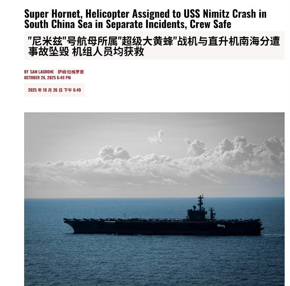 动不动就死在你家门口,还问你怕不怕,好烦! 其实这两个标题放在一块还挺抽象的,第1个标题是尼米米兹航母最后一次航行在南海对中国进行武力展示。 第2个标题尼米兹航母所属的超级大黄蜂战机与直升机在南海遭遇事故坠毁,机组人员均获救。 实在是太过于魔幻了,也不知道他们是怎么了,这一架飞机还不够,给大家上演了两遍。 各位是怎么看的?欢迎评论区留言。