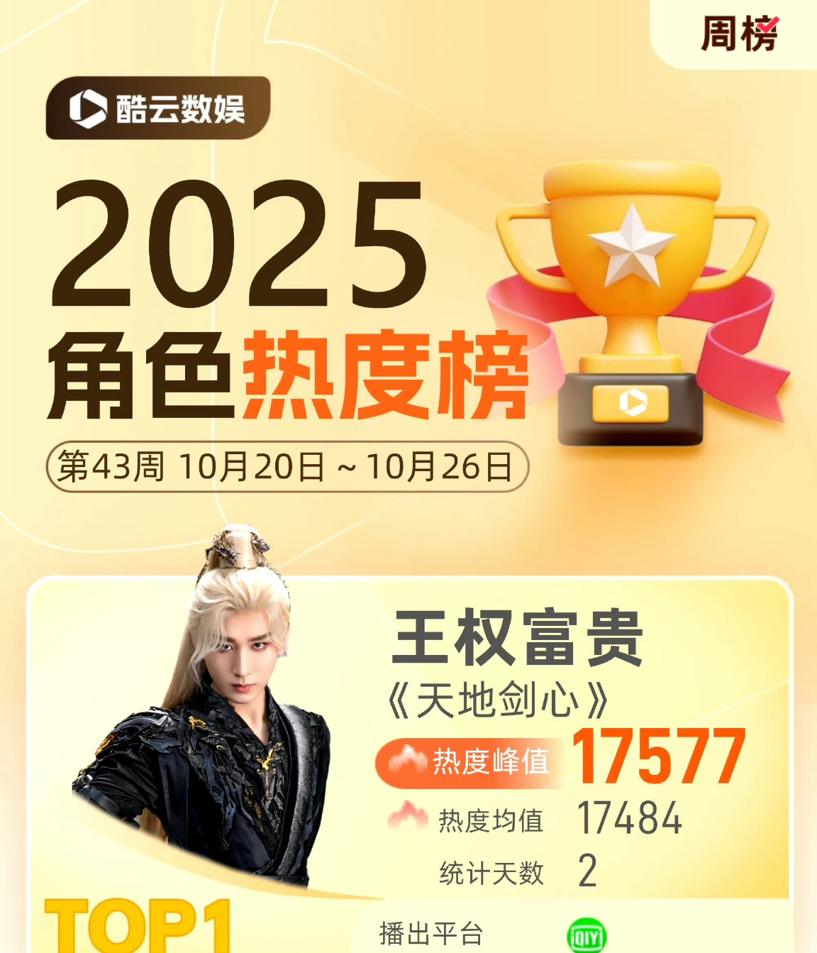 2025酷云角色热度周榜冠军:成毅天地剑心王权富贵!成毅扛剧能力太顶了!