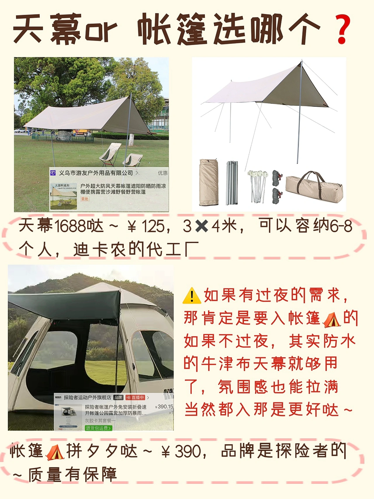 如果不过夜,其实防水的牛津布天幕就够用了,氛围感也能拉满