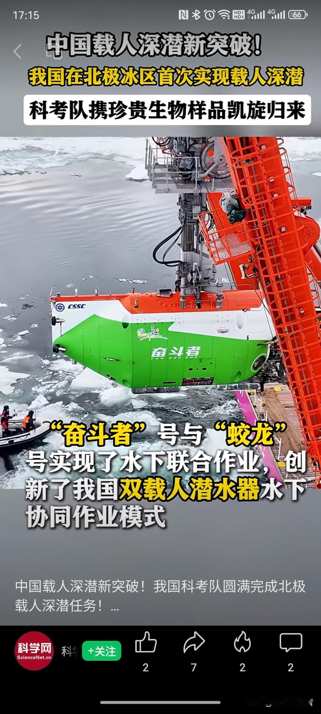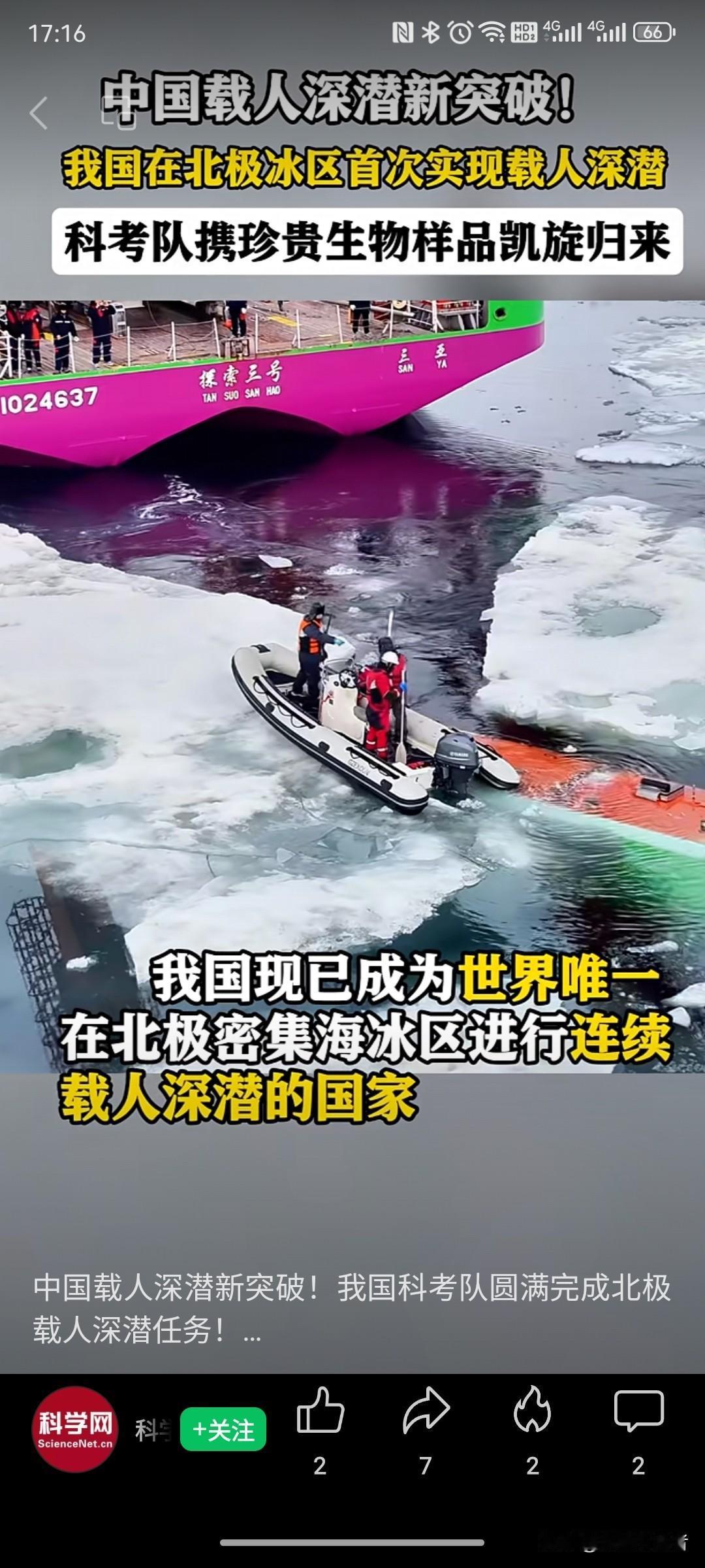 【北极冰层下,中国创造历史!全球唯一连续深潜纪录这样诞生】 在零下严寒与80%海冰覆盖的北冰洋中央海盆,一艘红白相间的巨轮破冰前行。甲板上,蛙人跃入浮冰缝隙,在刺骨海水中完成“奋斗者”号的极限回收——这是属于中国科考队的极地时刻。 今日,随着“探索三号”母船载誉归国,中国创下震撼世界的新纪录:成为全球唯一能在北极密集海冰区实现连续载人深潜的国家! “奋斗者”号与“蛟龙”号双潜水器首次在极地冰海完成43次精准作业,最大下潜深度直抵5277米加克洋中脊,开创了“船潜协同”的冰潜新模式。 为何这项突破价值连城? 当其他国家因浮冰撞击风险而却步时,中国科考队在北冰洋56天攻坚,采集到首批冰区深部岩石样本。这些珍贵数据将揭开北极气候剧变的密码,为我国在极地科学研究领域赢得绝对话语权。 看着蛙人在碎冰中 stabilise 潜水器的画面,不禁热血沸腾——这哪是普通科考?分明是科幻片照进现实!五星红旗在极地冰海中格外醒目,背后是中国科研人“向深海进军”的铮铮誓言。 你知道吗? 在冰区下潜时,潜水器需实时规避移动浮冰,导航精度堪比“太空穿针”。而“双龙戏冰”的协同作业,更意味着我国已掌握极地深海作业体系化能力。 有人问投入巨资探索极地意义何在?当北极航道的开通重塑世界格局时,今日积累的冰区探测数据,就是明天国家发展的战略筹码。从“跟跑”到“领跑”,中国极地科考正在书写人类认知北极的新篇章。 →对此你怎么看? 欢迎在评论区分享你对极地探索的见解!