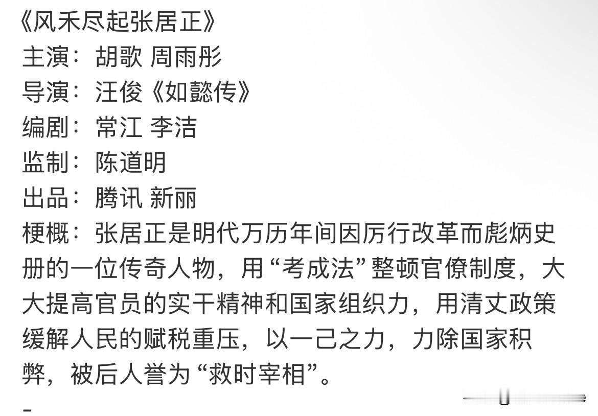 10月27日,胡歌《风禾尽起张居正》,这配置,片方这是打算让胡歌一拖全组么? 本
