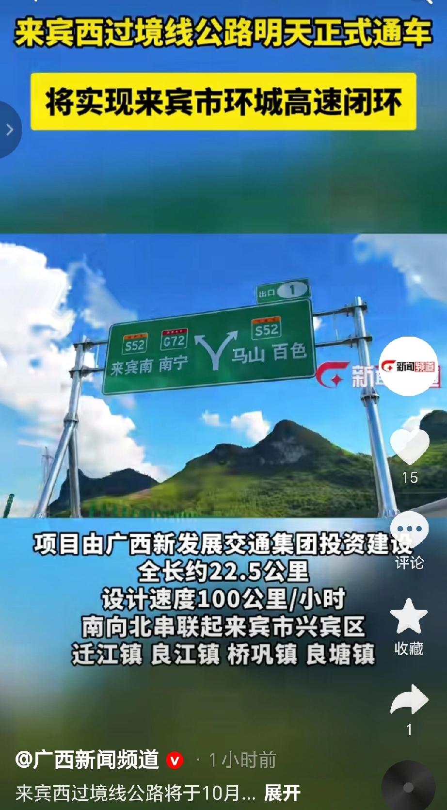 来宾西过境线公路通车(又称来宾西外环高速)将于10月28日正式通车-该项目由广西新发展交通集团投资建设,全长约22.5公里,设计速度100公里/小时,南向北串联起来宾市兴宾区迁江镇、良江镇、桥巩镇、良塘镇。(来源于@广西新闻频道 )