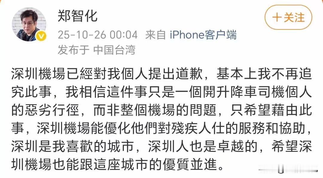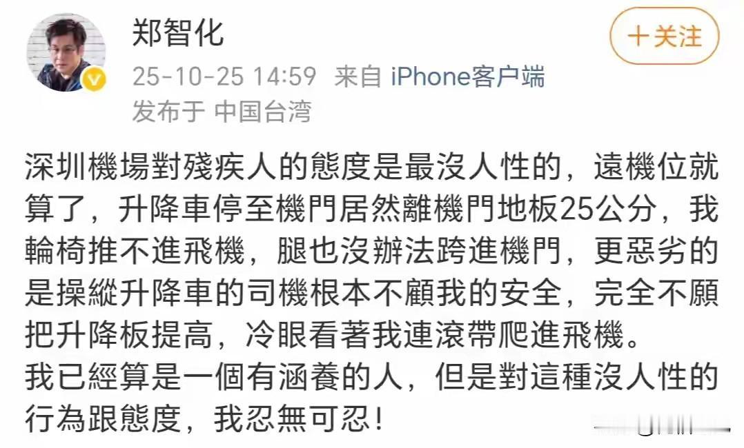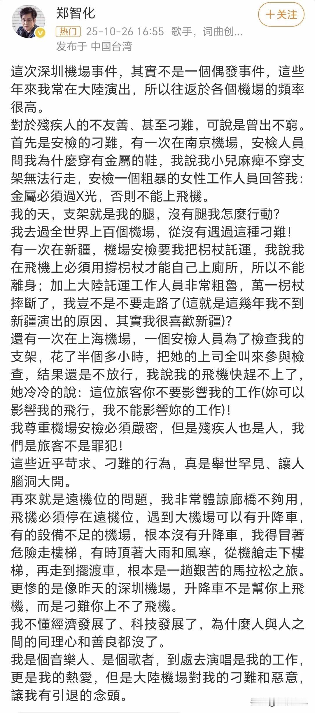真是太可怕了,如果没有监控,郑智化不是就得逞了吗? 他真的是太没良心了,公众信任他、心疼他,他却消费这份善意,这样污蔑抹黑人家。 监控里机场工作人员那么帮他,他怎么还好意思指责污蔑人家,真的是寒了帮他的人的心。 不得不说,一个人的人品,不要看他说了什么,更不要看他唱了什么,而是要看他做了什么!