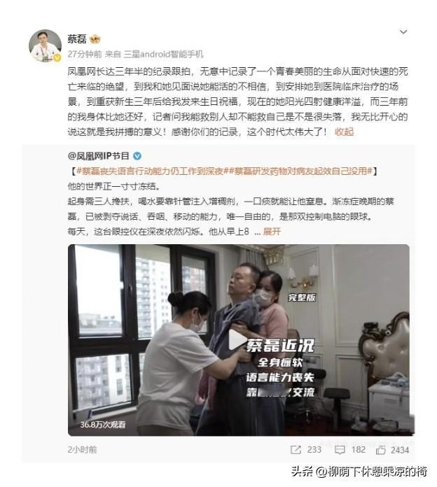 谁能想到,曾经风风火火的京东前副总裁蔡磊,如今要靠针管喝加了增稠剂的水,几毫升几毫升地慢慢喂,稍不注意就会呛咳窒息 。渐冻症晚期把他困成了“木偶人”,全身只剩眼球能自由活动,起身得三个人一起扶,说话、翻身全做不到,压痛和憋气每天都在折磨他 。 有人说他故意拒见老婆孩子,可谁懂这份隐忍——看着妻子段睿哽咽担心,听着儿子喊爸爸,他怕自己的狼狈击垮家人。所以他把所有力气都用在眼控仪上,从早到晚盯着屏幕工作,砸5000万资助上百个科研项目。 当看到20多岁的病友用药后重获新生,他笑着说“我羡慕你”,转头又咬牙坚持:“战斗成功,才是给家人唯一的希望”。这哪是拒见,分明是用生命为家人、为病友凿光。蔡磊寄语年轻人 蔡磊遗书 作家蔡磊 武穴蔡磊 蔡一磊 蔡潇磊 杨磊磊
