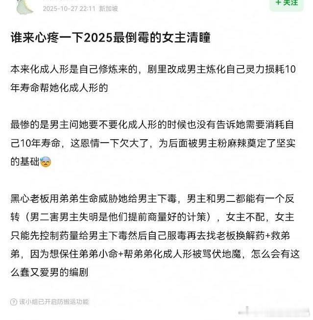 心疼清瞳,被编剧改的面目全非,不过男主的女主一直被改弱降智,最重要的是得欠男主很大恩情。
