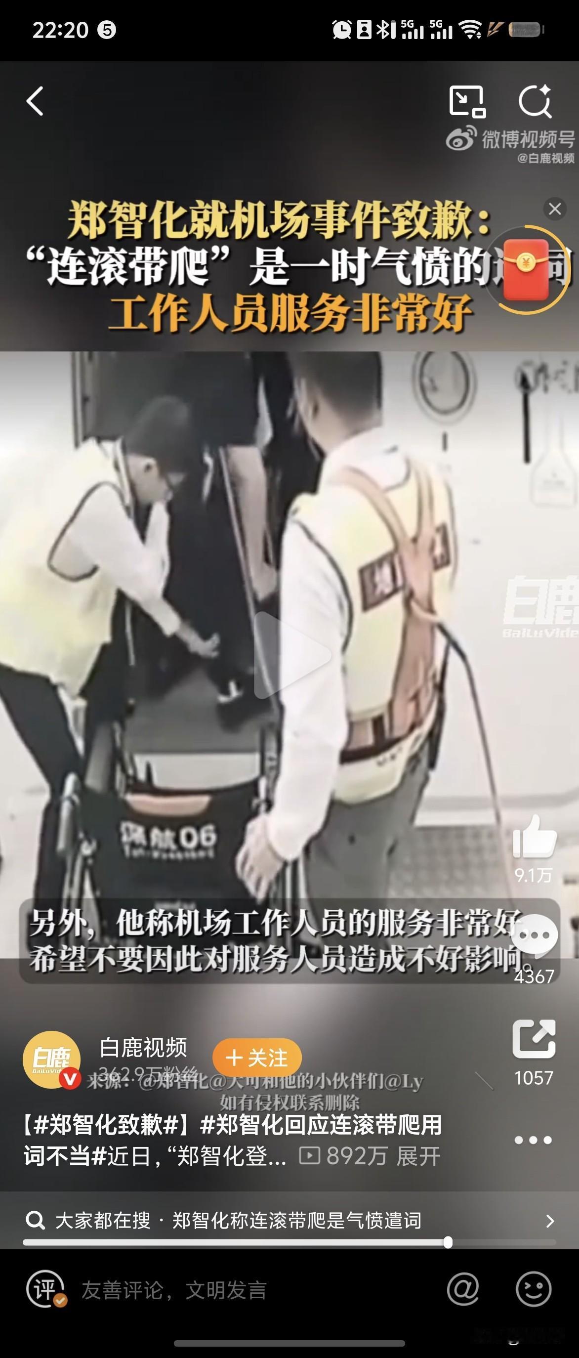 近日,“郑智化登机”事件发生后疑似现场视频的曝光引发讨论,网友质疑其最初“连滚带爬”的表述有所夸大。10月27日,郑智化再次发文回应深圳机场事件,并就自己用词不当致歉。 视频显示,帮他推轮椅的小哥服务非常好,不仅搀扶,还帮他搬腿进去机门。 视频监控果然是个好东西… 郑智化道歉 郑智化