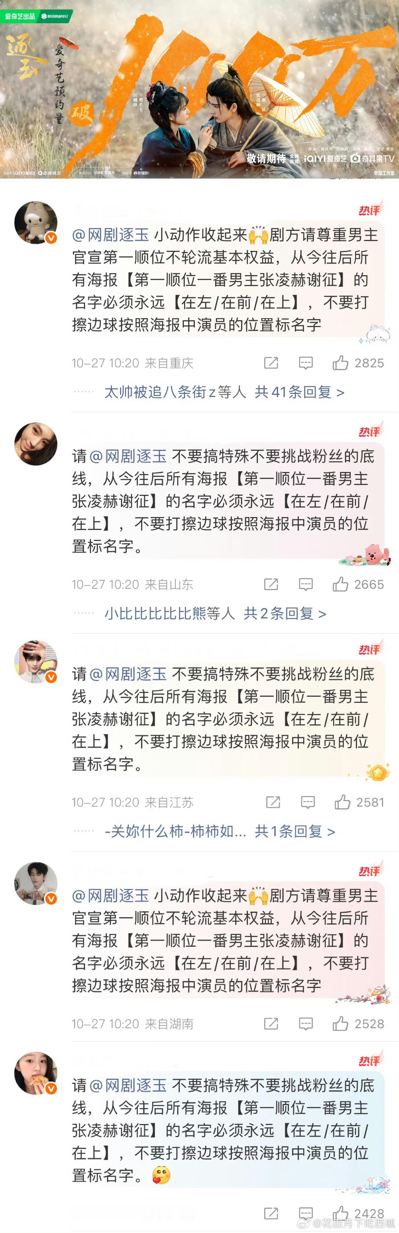 小核桃不满意《逐玉》海报🍩在左🐮在右,要求必须男主在左。 也不满意《这一秒过火》🐮和🚢两个人共用一个封面,要改成张凌赫单人封面!