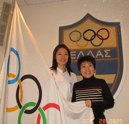邓亚萍和罗雪娟,与奥运五环旗一起合影,体现了奥运会更快、更高和更强的运动宗旨。