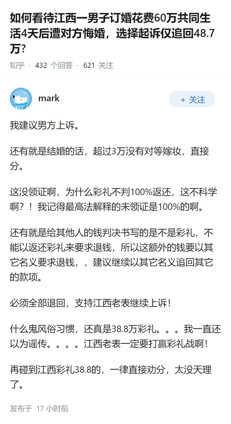 如何看待江西一男子订婚花费60万共同生活4天后遭对方悔婚,选择起诉仅追回48.7万?