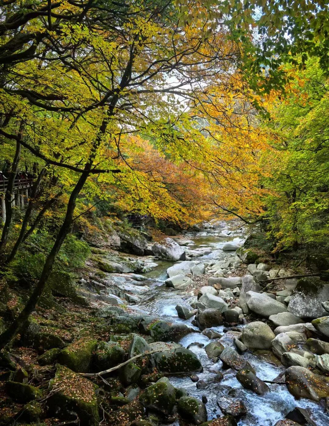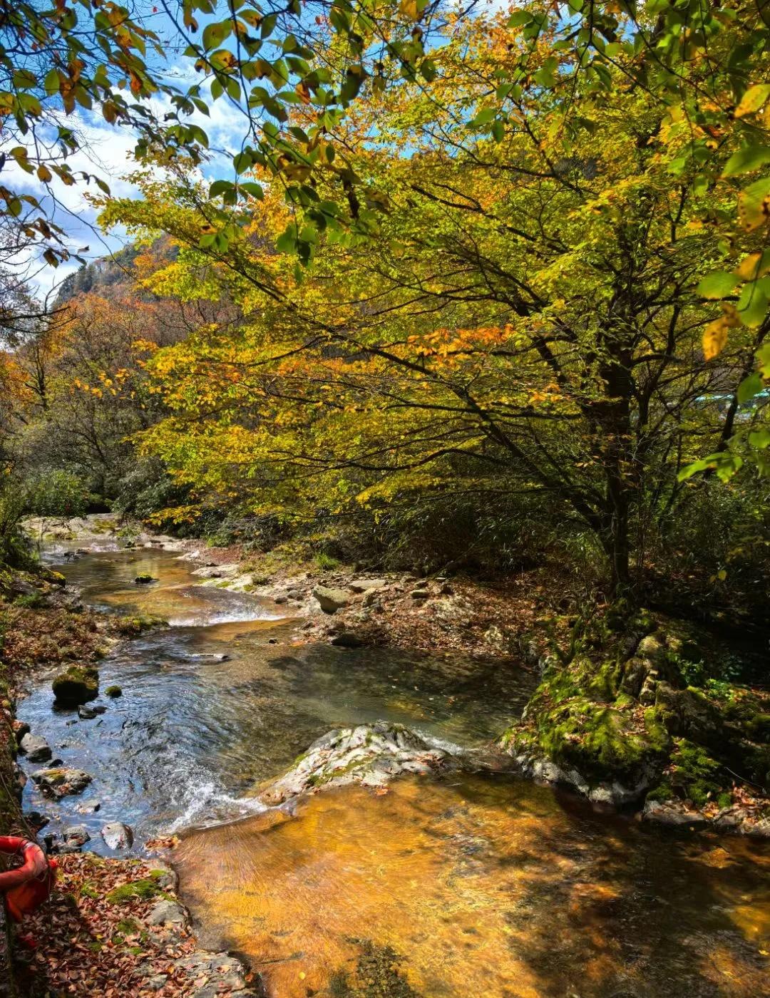 OMG我闯入童话里面了!重庆自驾巴中光雾山 在光雾山入秋 看到了童话书中的景象 全部原图直出啊 随处可见木头鸟巢 光雾山的维护人好有童心 超级可爱的! 2024年10月27日我们出发的 从重庆到光雾山全程自驾约5小时 中间可以在南江县城休息一晚再出发 南江县城江景夜景不错 住宿建议定在中嘴大桥附近 这里是南江县城中心比较繁华 可以逛一逛 推荐一个吃晚饭的小店伍斗米家乡味,是地道的川菜农家菜很香(图15) 分量也特别足 比较干净哦 我们五个人点了三个菜就够了也便宜 光雾山是大景区 包括光雾山、米仓山、十八月潭 最重要的是看红叶红的程度 各个景区海拔不同 红有早晚 大家可以搜一搜路人分享的最新实况 我们只去了米仓山 米仓山门票90元 观光车60元 米仓山的黑熊沟是非常值得的 主要是走栈道一天只能玩一个小景区 建议大家也带一点好走的鞋子哦 衣着10月下旬建议开衫毛衣加一般厚的大衣(开衫的方便穿脱) 因为赏秋人很多 山路难行 请大家避开下雨的时候 人最多的就是天然画廊的木头栈道 基本上人挤人 脚挨着脚 但坚持二十分钟过了这里就好很多 潺潺流水 红枫大道 不愧是中国第一红叶观赏地 巴中和汉中只隔一条山脉 翻过山可以在分界线秦关留影(图16) 本来计划第一天光雾山第二天汉中 结果第一天下大雨 果断换计划 所以旅行中最重要的就是要随机应变 汉中的分享下篇发光雾山红叶 山里的秋天 秋天去看彩林