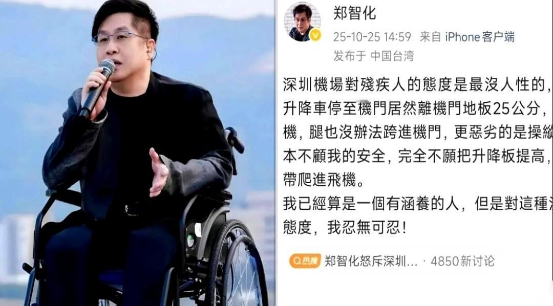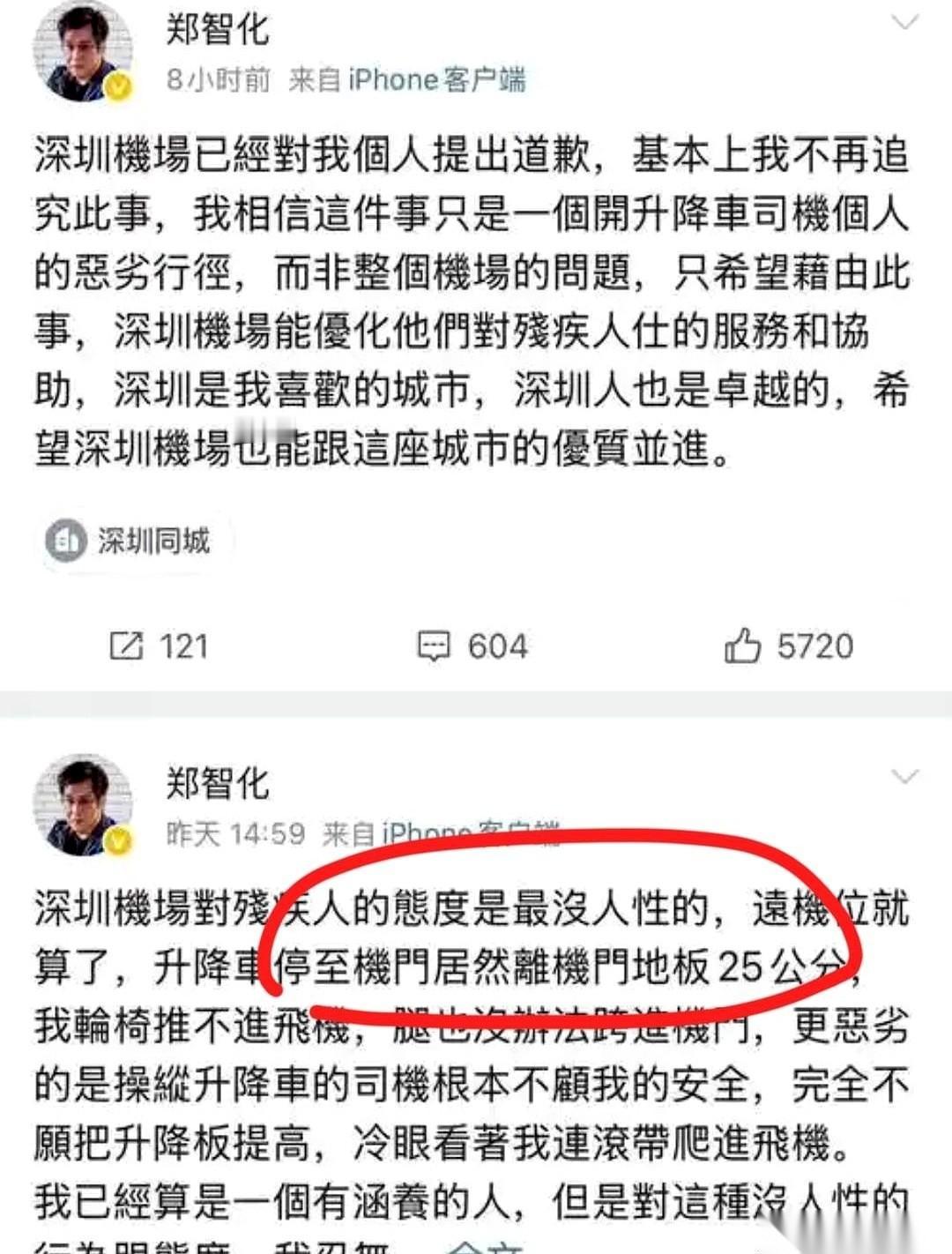 我靠,这事儿看得我拳头都硬了。 一个坐轮椅的人,就卡在飞机舱门口,差那25厘米,死活上不去。最绝的是,旁边开升降车的司机,就那么冷冷地看着。 看着人家一个大活人,在众目睽睽之下,进退两难。 然后机场半夜出来道歉,说是什么狗屁规定,为了安全,车和飞机必须留20厘米的缝。 我听了都想笑。 安全? 让一个行动不便的人,在半空中冒着摔下去的风险,这叫TMD安全? 你那20厘米的安全距离,是用来保障飞机的,不是用来为难人的。 规定是死的,人是活的啊哥们。 你哪怕搭把手,或者动动脑子用个板子垫一下,至于让人家一个公众人物,事后愤怒地写下“连滚带爬”这四个字吗? 那点人情味儿,比你的KPI金贵多了。 行吧,深圳机场反应还算快,连夜道歉、加人、研究新设备。 这值得点赞,但说实话,这不该是出了事、上了热搜才想起来的吗? 这种“缝隙”,在你们日常工作中,肯定不是第一次出现吧? 这事儿就像一面镜子。 照出我们身边多少地方的“无障碍设施”,其实都是“有障碍设施”。 不是陡得能起飞的轮椅坡道,就是常年上锁的无障碍电梯,再不然就是被共享单车堵死的盲道。 建的时候轰轰烈烈,用的时候鬼影都看不见一个。 郑智化老师说得挺体面,不追究个人,只希望服务能优化。 但我们这些普通人心里都明白: 真正的尊重,不是墙上贴个标语,不是文件里写得漂亮。 而是当那个25厘米的缝隙出现时,会有人下意识地、毫不犹豫地想去把它填上。