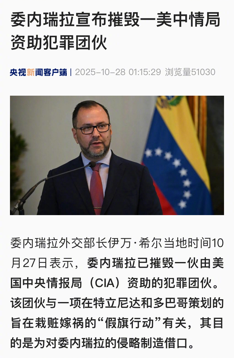 【委内瑞拉宣布摧毁一美中情局资助犯罪团伙】委内瑞拉外交部长伊万·希尔当地时间10月27日表示,委内瑞拉已摧毁一伙由美国中央情报局(CIA)资助的犯罪团伙。该团伙与一项在特立尼达和多巴哥策划的旨在栽赃嫁祸的“假旗行动”有关,其目的是为对委内瑞拉的侵略制造借口。(央视新闻)