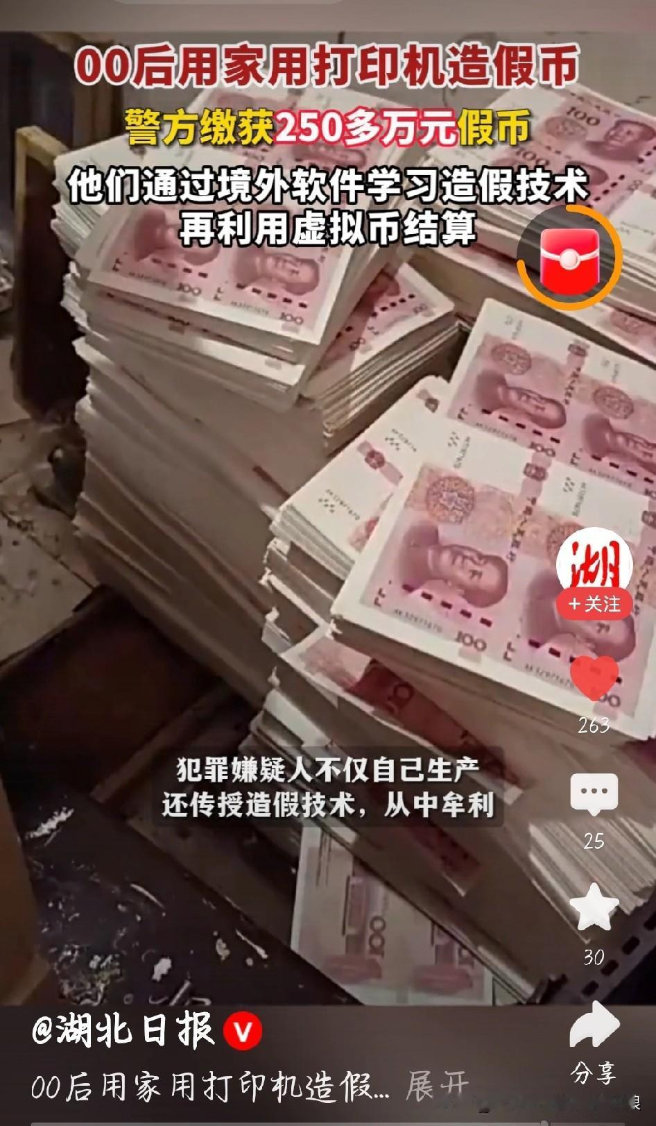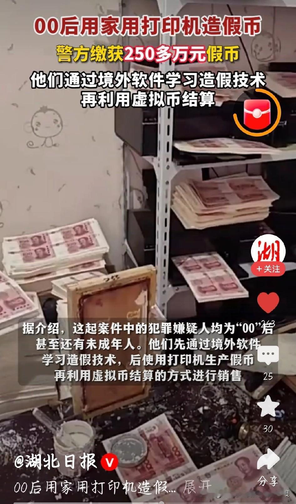 刚刷到这案子,简直不敢信!北京警方捣毁的假币窝点里,15个嫌疑人全是00后,甚至还有未成年人,250多万假币居然都是家用打印机打出来的 。 民警冲进去时,打印机还在“唰唰”吐钱,空气里全是墨水味。这帮年轻人太胆大,从境外软件学的造假技术,网上随便买的打印机、特种纸,扫描真钞修修图就敢印,还做旧、造凹凸感骗路人。 更缺德的是,他们专挑夜市、小超市和老人下手,用虚拟币结算卖假币,甚至还教别人造假牟利。 真以为这是生财捷径?伪造货币数额特别巨大,等着他们的是重刑 。年纪轻轻不走正路,想靠歪门邪道赚钱,早晚得栽大跟头!00后用家用打印机造250多万假币 00后 家用打印机 图片截图于湖北日报