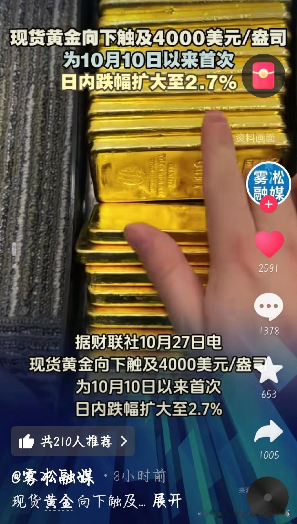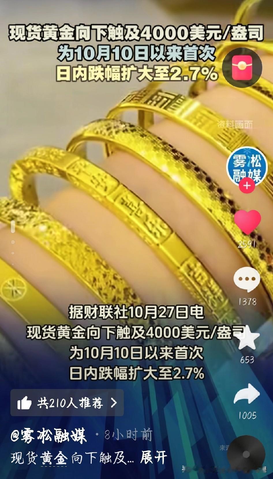 金价跌破4000美元!这信号普通人得看懂 刚刷到消息,10月27号晚上现货黄金跌破4000美元/盎司了,这还是10月10号以来头一回。前阵子追着买黄金的人,估计这会儿心里打鼓了。 说白了,金价跌不是没原因。中美贸易协议有了进展,大家不那么慌了,也就不用靠黄金避险了 。而且之前黄金涨得太疯,从年初到现在都涨超50%了,早该回调了,不少人赚了钱就赶紧卖,一抛售价格自然下来了 。 这事儿对普通人是个提醒:别跟风炒黄金。之前就有大学生投生活费进去,现在都亏哭了。专家都说了,金价跌其实是经济转好的信号,说明有比握黄金更划算的出路了。想打金镯子的倒可以等等,要是投资,可得多琢磨琢磨!黄金行情价格 金价行情 黄金大盘价行情 金价回收行情 黄金售卖价格 实时金价 黄金跌破4000美元 图片截图于网络