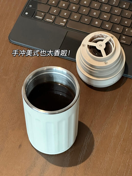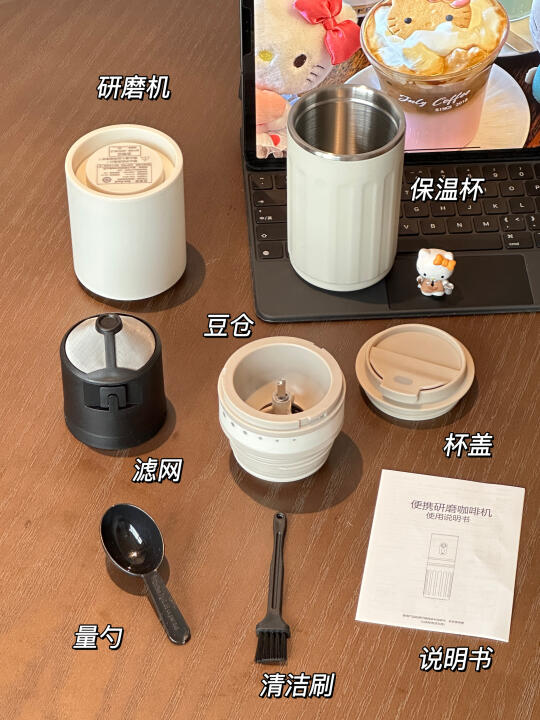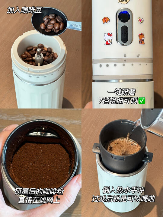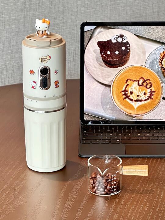 新入的便携咖啡机也泰🐮了 小小一个实现研磨➕冲泡➕保温 一机就可以搞定✅ 出门带上直接实现咖啡自由 电动磨豆嘎嘎方便 七档粗细研磨可调满足不同需求 加入咖啡豆研磨后直接手冲萃取就可以啦 几分钟时间就可以喝上手冲美式 装上杯盖就是一个随行保温杯 泡好的咖啡可以直接带出门~ 尊嘟是懒人福音了!! 加点冰块就能get冰美式啦 还可以自己diy拿铁之类的 建议咖啡脑袋人手一个😭 自己diy了kitty贴纸!! 更喜欢啦