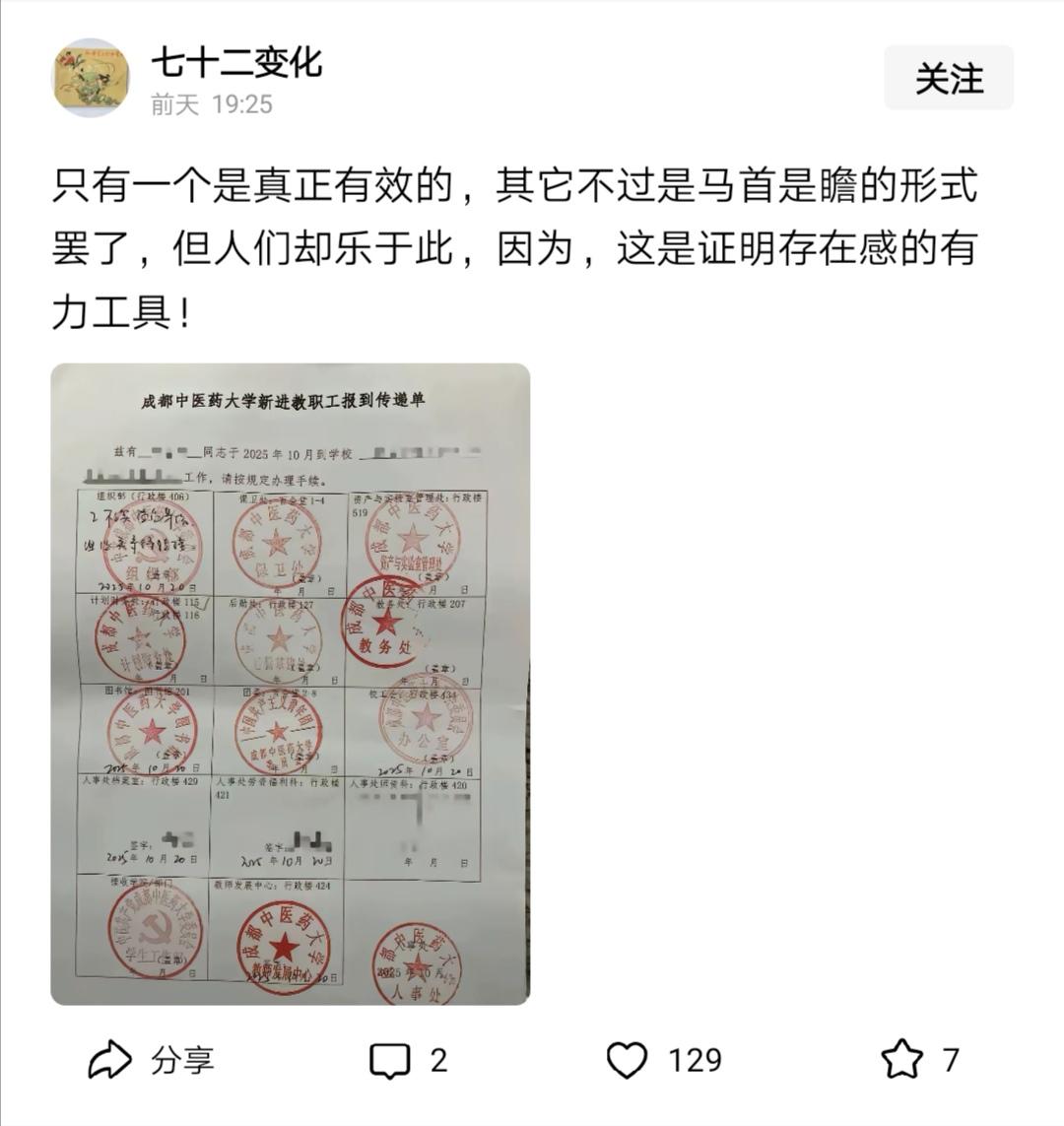 有人说,学校这么做,要求新教工入职盖这么多公章,是为了让新教工了解这些部门,因为今后工作、生活免不了要和这些部门打交道。 而一些人不理解,为何一定要让教师去跑这些部门,学校不可以建立更便捷的以教师为本、服务教师的工作体系吗? 曾有教师抱怨,很多繁琐的事务性工作,分散教学与科研精力,但是,抱怨归抱怨,能让各部门领导围着教师转吗?能指望校长都像梅贻琦校长说的那样带着行政人员为教授搬凳子吗?就是配科研助理,也轮不到青年教师。 所以,入职要盖这么多章就是当前高校管理的现实,真正做到以教师为本,让行政部门有服务意识与理念,就得推进学校建立现代大学制度、教育家办学。