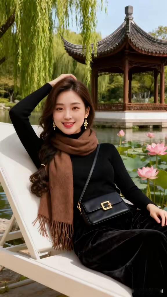 在古典园林中享受悠闲时光,黑裙与棕色围巾的优雅搭配,尽显东方韵味。