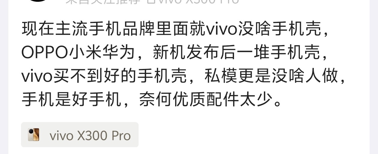 看到一个网友说vivo手机的手机壳样式少,华为、小米、oppo的手机壳相对比较多