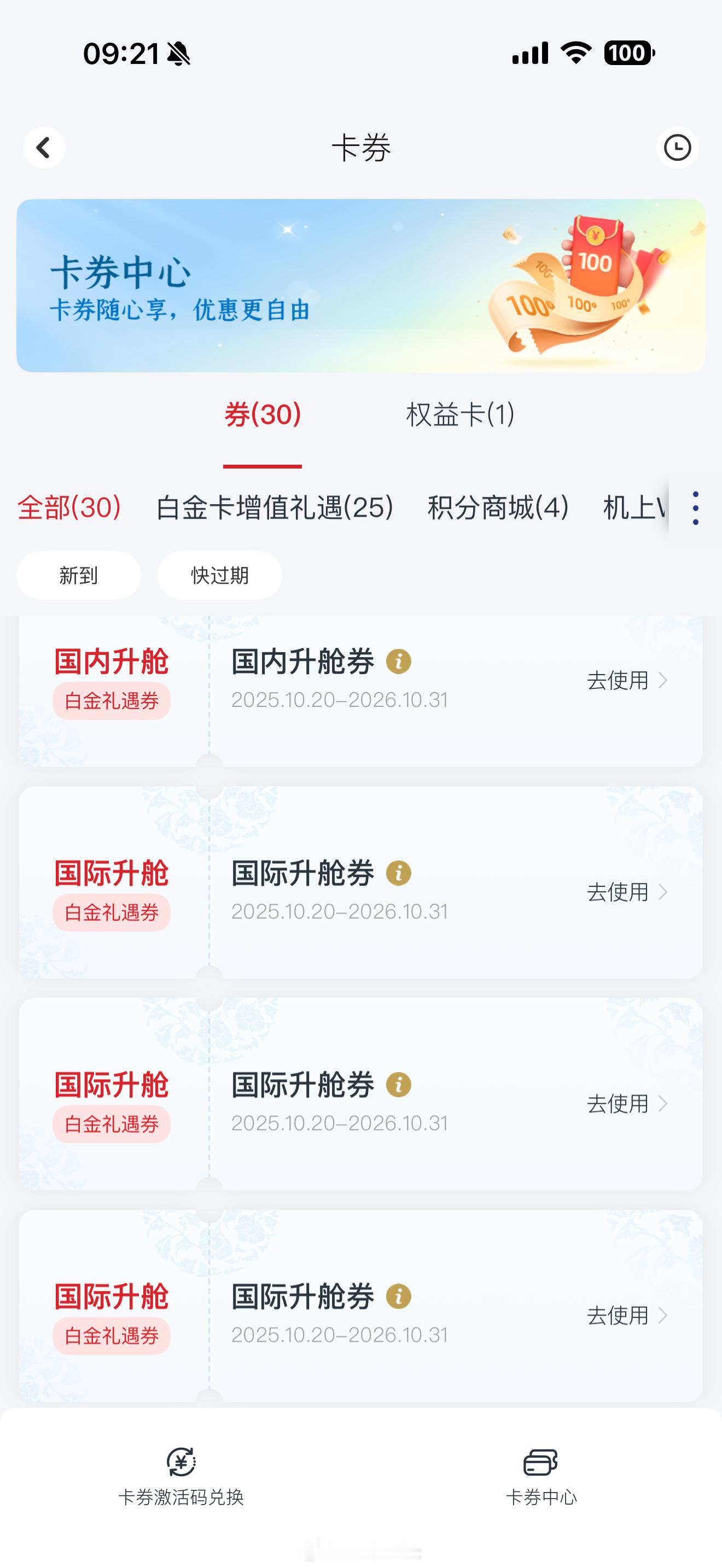 第一次把东航飞上白金卡,就是为了赠送的20张国内升舱券+4张国际升舱券