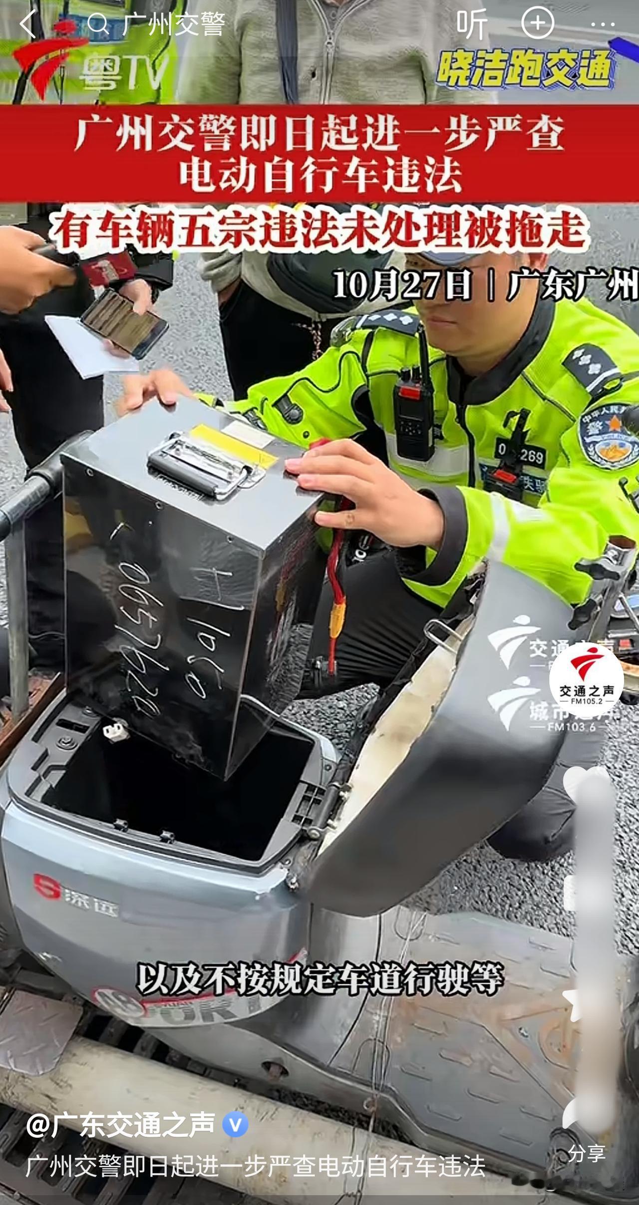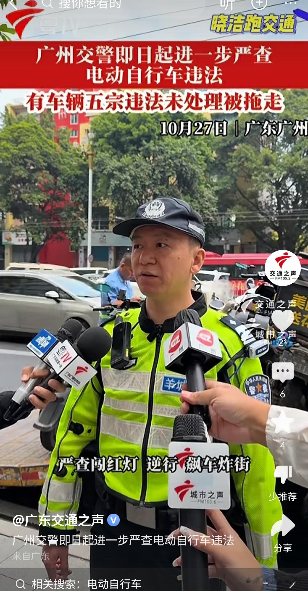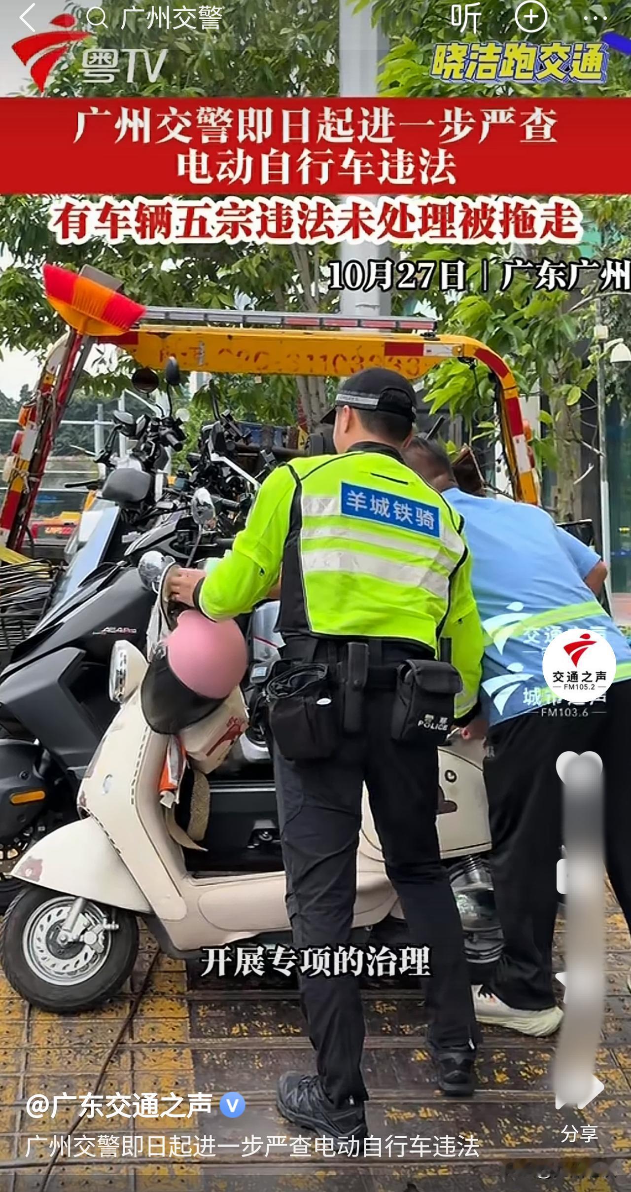 广州又出大招了!“百日行动”护全运,多管齐下保安全! 即日起,广州严查电动自行车违法!尤其严查闯红灯、逆行、飙车炸街、非法改装、闯桥隧、无牌、假牌、多宗违法未处理等。 在地铁口、主干道、外卖站点等集中场所进行专项整治。 广大电鸡驾驶人,既然政府为我们开放了电动自行车上路行驶,那就要珍惜这来之不易的机会,遵守交通规则,安全行驶,遵守规则停放,不占道,不堵路。 同样的机动车也不要占据非机动车道,本来非机动车道就窄,汽车就像堡垒一样停在非机动车道上一停就几个小时甚至几天,影响成千上万辆非机动车的安全通行。 适合建设机非共享车道的道路,尽量都改造成共享车道,满足数量庞大的电动自行车通行。 例如鹤洞路、华地大道南路段设置共享车道后,基本上没有非机动车走机动车道了。 因为共享车道够宽,也没有机动车违停,可以满足非机动车通行,让电鸡有路可走。 这也说明了,只要非机动车有路走,就不会故意走机动车道,非机动车道有3-5米宽,就可以解决绝大多数走机动车道的问题。 实际上电动自行车并不会像机动车一样,占据很大的道路资源。