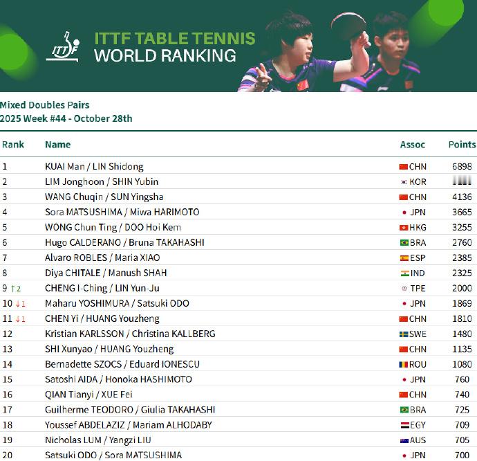 混双:林诗栋/蒯曼第1、王楚钦/孙颖莎第3、黄友政/陈熠第11