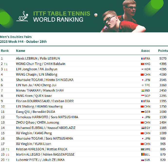 男双:王楚钦/林诗栋第4、林诗栋/黄友政第10