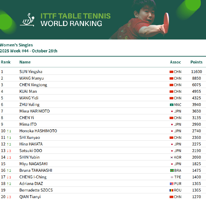 女单:孙颖莎11600分、王曼昱、陈幸同、蒯曼、王艺迪位列前五,陈熠第8