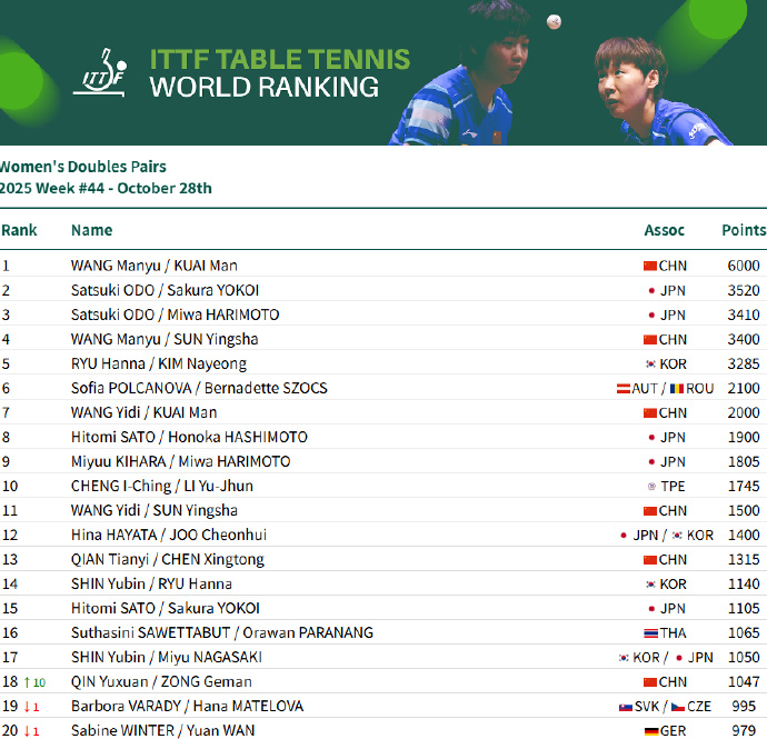 女双:王曼昱/蒯曼第一、孙颖莎/王曼昱第四、蒯曼/王艺迪第7、孙颖莎/王艺迪第11