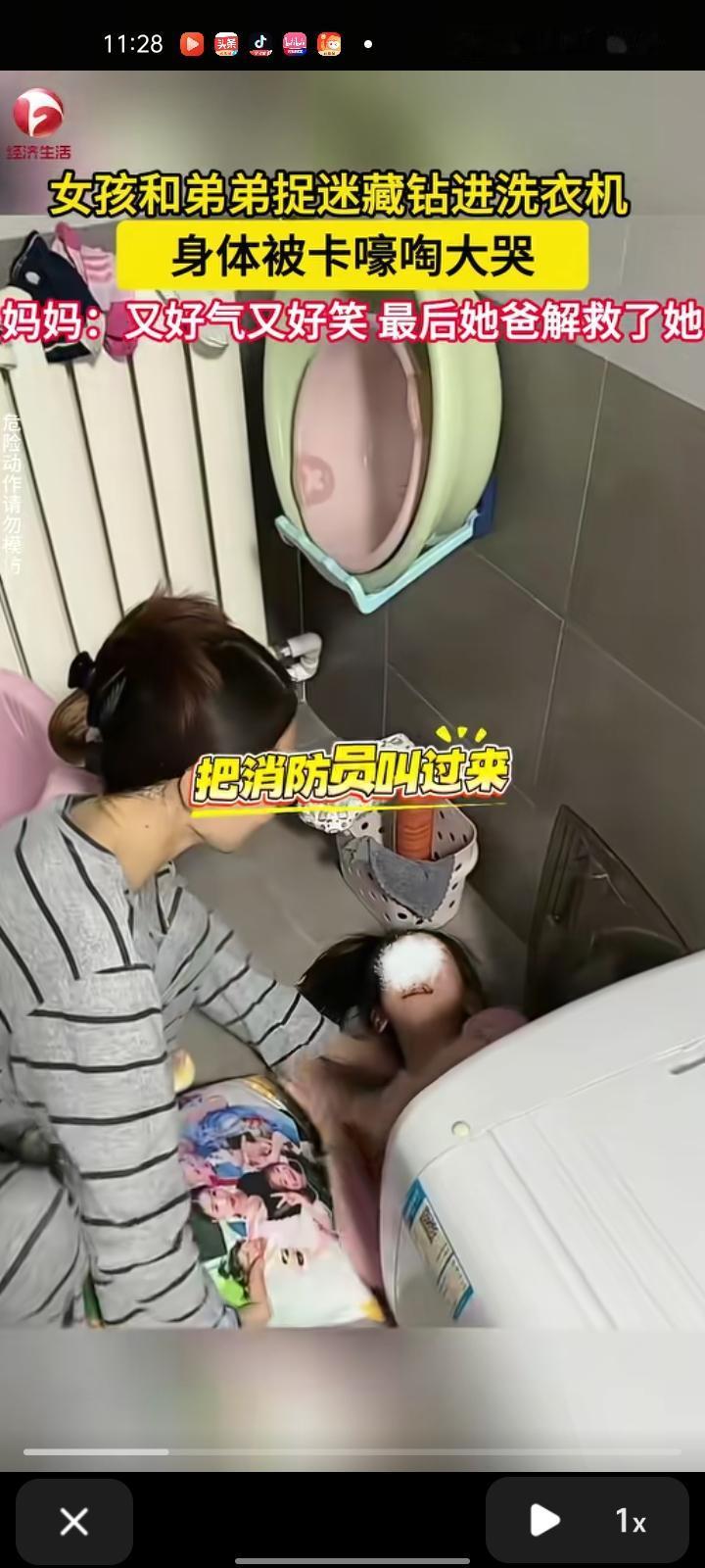 10月27日,河南濮阳。孩子妈妈发布视频称,女儿跟弟弟玩捉迷藏躲进洗衣机,没想到身体被卡后嚎啕大哭。 孩子妈妈介绍,家中老二平时比较调皮,洗衣机是放在旁边不用的,没有插电。她和弟弟玩捉迷藏时因为自己完全盖不住,把自己的腿折叠有出不来了。又好气又好笑,最后她爸解救了她。