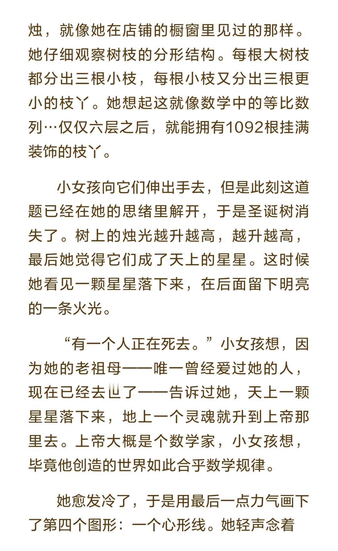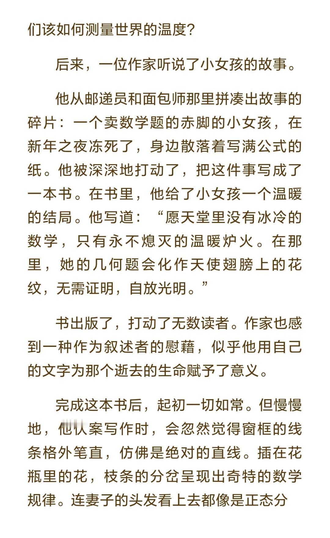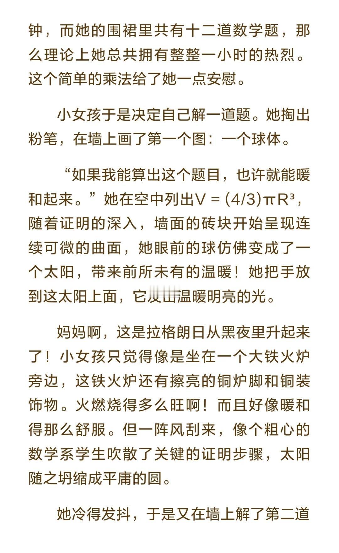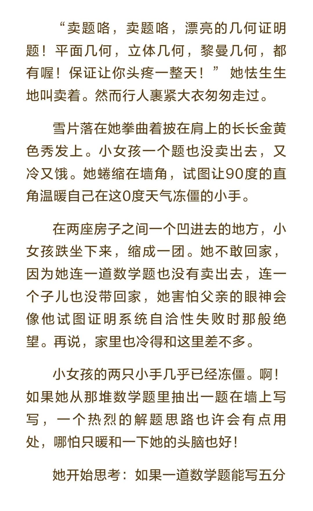 卖数学题的小女孩 🔢🔣 感谢大家厚爱🫶 前几天写了数学版睡美人,好多人说喜欢,想看别的数学故事,所以这两天又写了一篇! (也有好多人说看不懂,其实我写完之后过两天再看也懵懵的,光滑流过大脑) 我自己编了好几个数学冷笑话塞进去哈哈哈哈哈,写的时候笑到好多次,感觉自己是天才来的。 以及其实我是个数学笨蛋啊啊,谢谢大家不嫌弃我四处漏风的知识!感觉大家所有的夸奖,我将打印下来每天读一遍然后带到墓里为我陪葬💤爱你们。 早八的大家加油,考研的大家加油! 请用!🤲 哥德尔不完备性定理:在一个足够复杂的数学系统中,存在既不能被证明,也不能被证伪的命题。 . 数学是人都会 我是人吗 困 数学 高数 童话 几何 事已至此先睡吧 一觉醒来天塌了